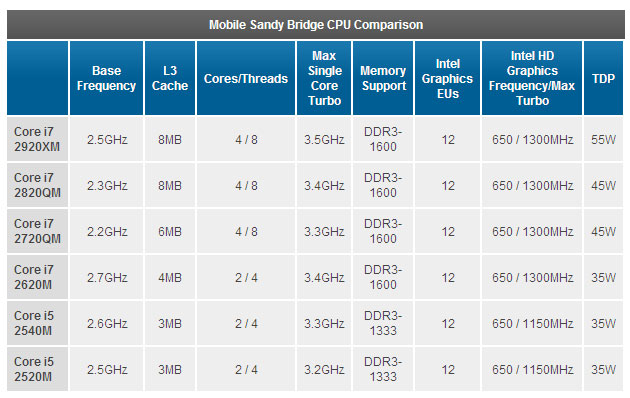 Si può notare che ci sono alcune variazioni rispetto alle versioni desktop. Le frequenze di clock sono comprensibilmente più basse e tutti i processori hanno Hyper Threading abilitato. Sandy Bridge Mobile supporta ufficialmente fino a DDR3-1600, mentre le CPU desktop, con l'esclusione delle versioni top, DDR3-1333 (anche se i 1600 Mhz non dovrebbero essere un problema sul chipset P67).