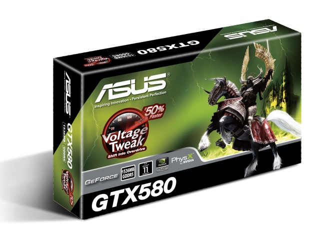 Asus introduce la propria proposta di GeForce GTX580, dotata di overclock di fabbrica e del Voltage Tweak technology, che permette di regolare il voltaggio della gpu e quindi di salire parecchio con le frequenze.