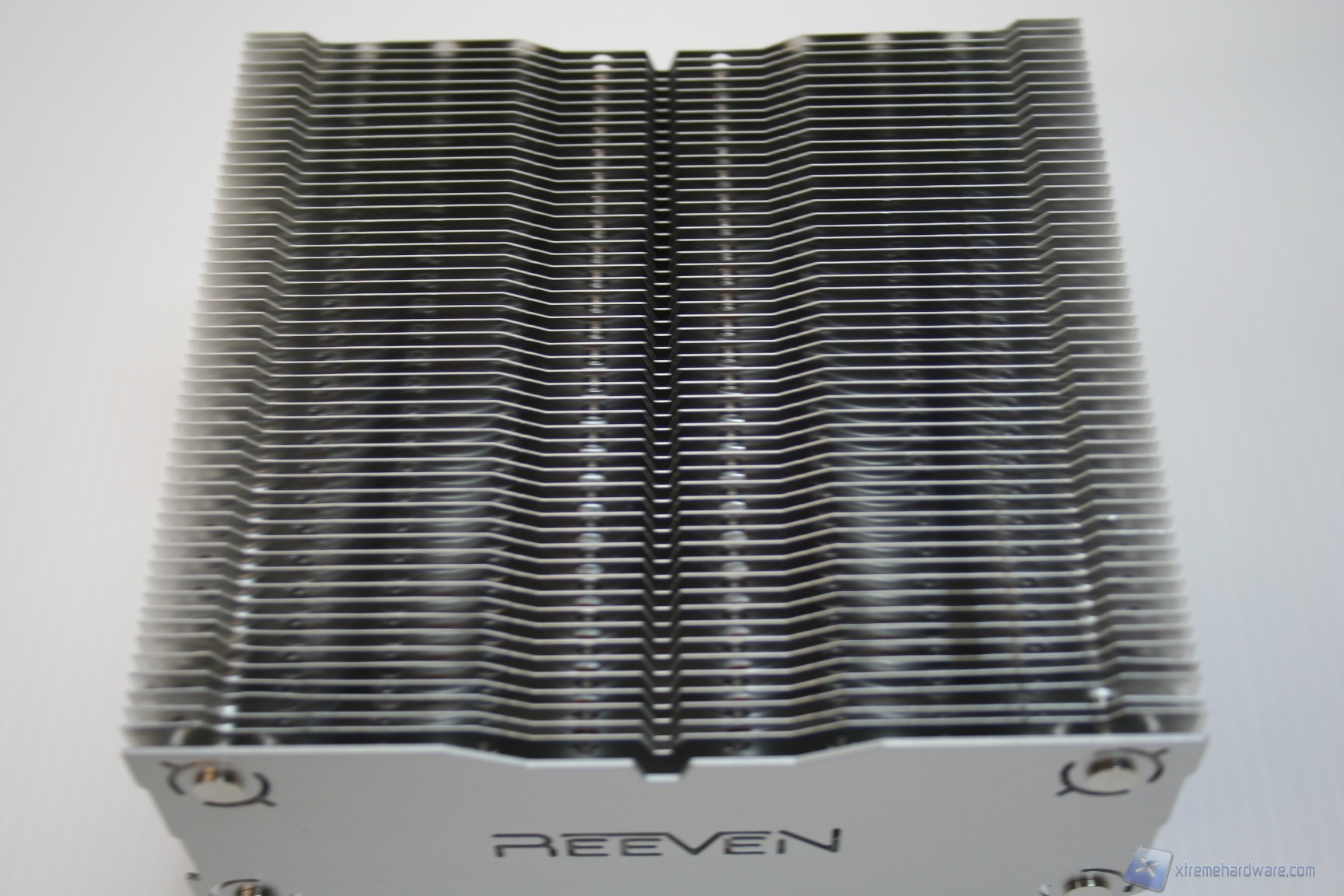 L’Arcziel 12 appartiene alla tipologia top-down, ovvero fa parte di quelle soluzioni che hanno come obbiettivo la diminuzione dell’altezza complessiva (che si attesta a 126mm), facilitandone quindi l’installazione in cabinet di piccole dimensioni. Permette inoltre una dissipazione attiva delle componenti della scheda madre, che vengono infatti investite dal flusso d’aria della ventola superiore del dissipatore, in configurazione Push. Il numero 12 sta ad indicare la dimensione della ventola in cm, e si distingue dall’altro modello, dotato di ventola da 92mm e caratterizzato da dimensioni ancor più ridotte. Il design dell’unità è standard, però sono presenti delle ricercatezze strutturali tali da permettergli ottime prestazioni complessive, anche con TDP elevati. Data la struttura non è possibile montarne una seconda nella parte inferiore. Il peso è contenuto e la solidità strutturale è davvero elevata, e questo è un grande punto a favore perché si comprende immediatamente che il design e la tipologia di assemblaggio sono molto curate, una caratteristica che come vedremo è presente in tutte queste soluzioni Reeven. Le dimensioni sono di 140x131x126 (LxPxA) e presenta sei heatpipes da da 6mm aventi una struttura alternata che ne permette una distribuzione uniforme e doppia in altezza. Facciamo notare che le heatpipe sono ripiegate al fine di attraversare la struttura con entrambe le estremità, una caratteristica affatto comune per i dissipatori top-down. Il design delle alette è teso ad abbassare il coefficiente di attrito dinamico, per via della spaziatura elevata tra di esse che quindi permetterà anche l’adozione di ventole con bassa portata d’aria.