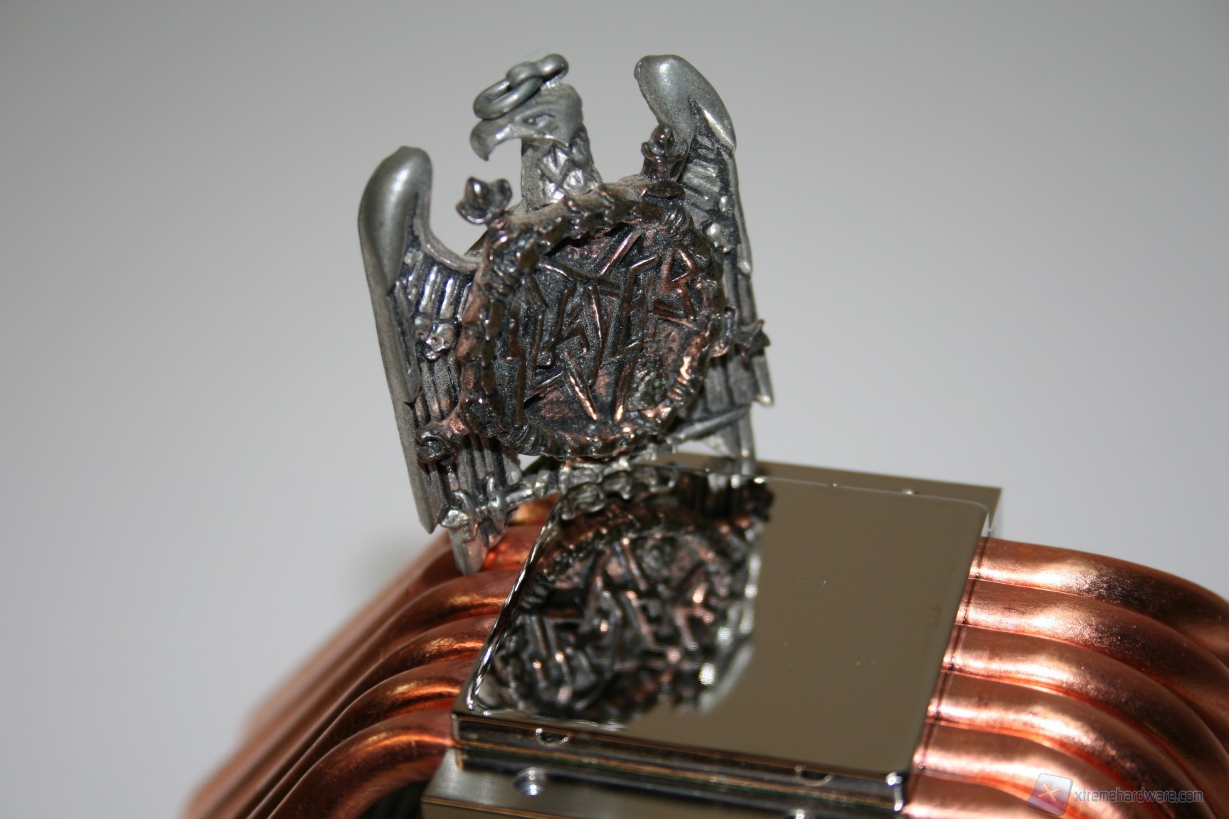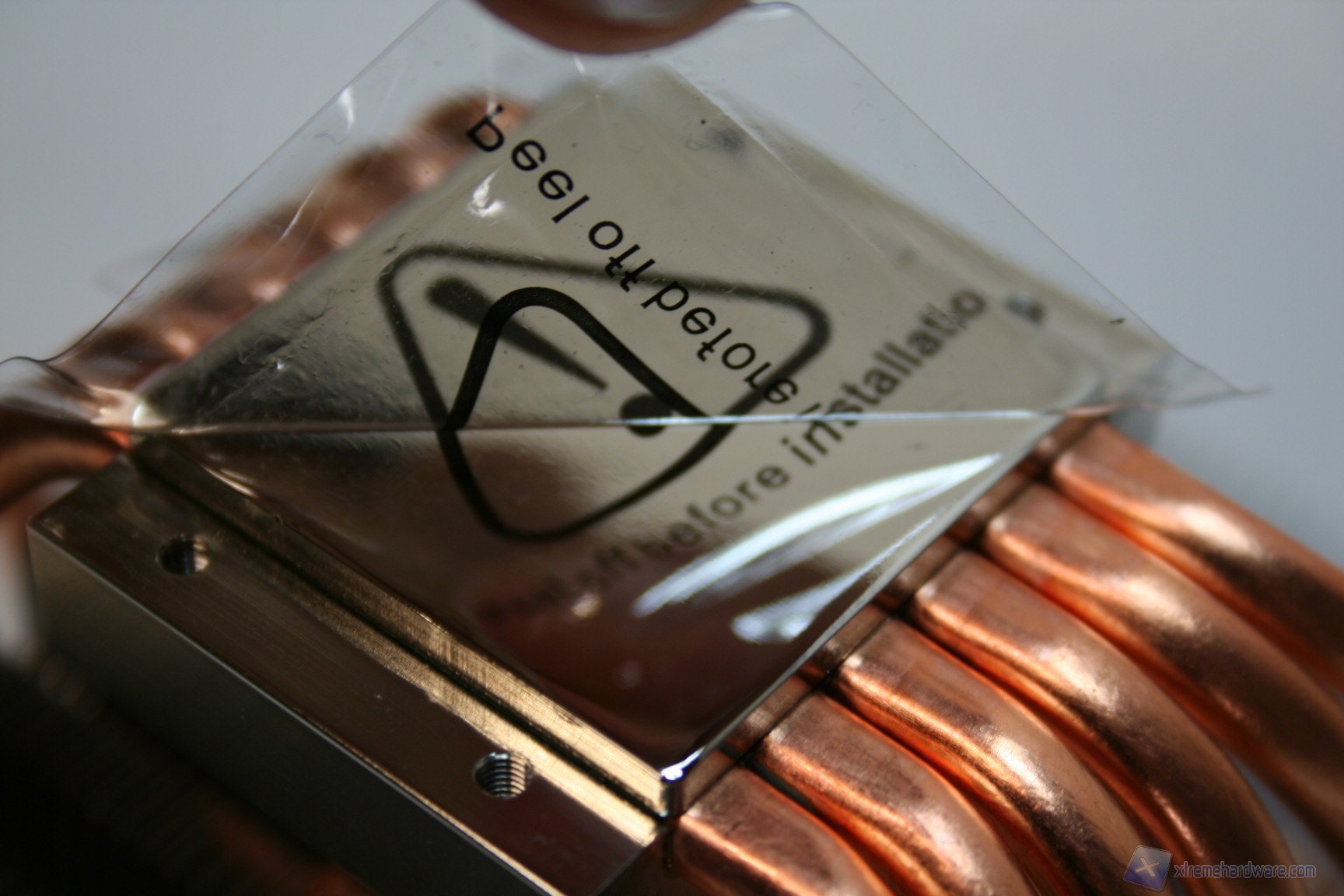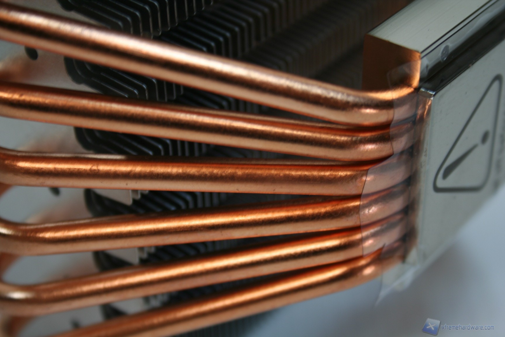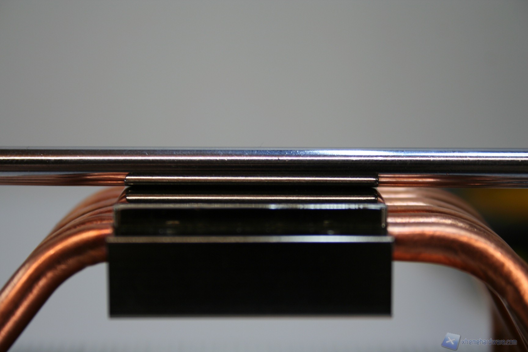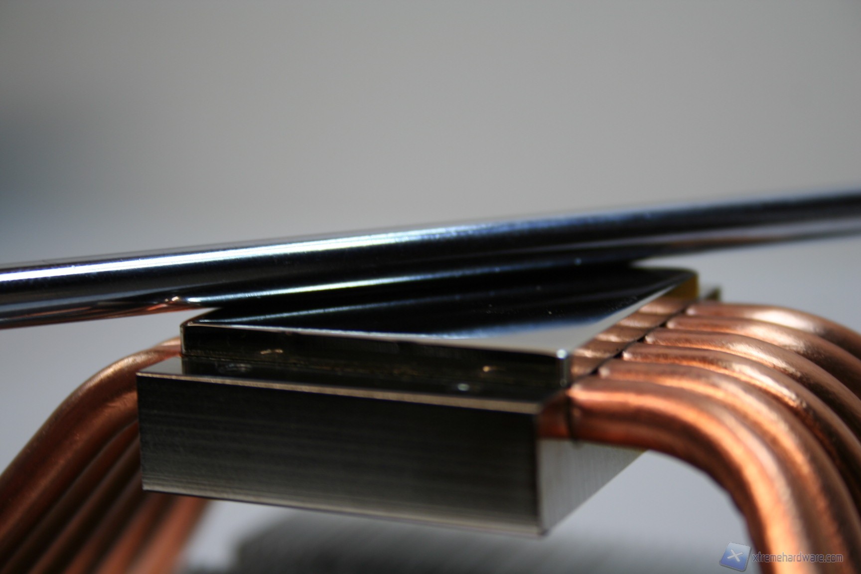 La base di contatto presenta una finitura molto buona ed una superficie lucidata a specchio; non è HDT bensì classica, con le heatpipes inserite all’interno di una base dissipante. Non è presente nessuna curvatura centrale convessa, che generalmente veniva adottata nei socket passati per migliorare l’impronta di contatto della CPU. Questo era un problema noto dei socket 775, X38/48 e non ultimo per importanza l’X58, che spesso ha portato ad una curvatura del socket stesso.