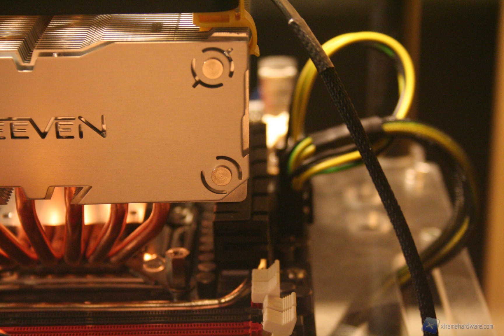 Terminata questa procedura si stende un sottile velo di pasta termica sulla base della CPU. Fatto questo si monta il dissipatore sul socket X79 e si comincia a fissarlo sulla scheda madre grazie alla chiave precedentemente menzionata. La procedura può essere lunga, ma perlomeno assicura un contatto perfetto, duraturo e potente. Fatto questo installiamo la ventola da 120mm, che poi connettiamo ai vari sistemi di regolazione, della motherboard o di fan controller. Nel complesso, consigliamo di rivedere questo sistema nelle prossime versioni, perché è davvero scomodo.
