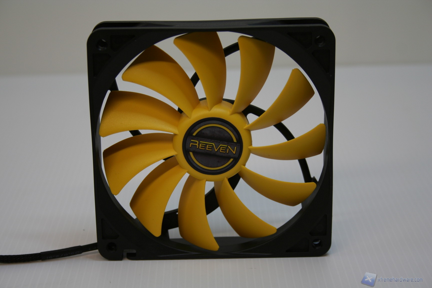 E’ stata fornita in dotazione una ventola da 120mm dell’ultima serie Reeven “Cold Wing”, in colorazione gialla per le pale e nera per il telaio. Le caratteristiche tecniche sulla carta sembrano davvero molto interessanti, ma verificheremo questo comportamento nel prossimo roundup dei sistemi di ventilazione, già in preparazione. La ventola è dotata di undici pale, dalla tipologia standard, presenta inoltre una leggera curvatura del motore frontalmente, per favorire l’ingresso dell’aria, ed infine è dotata di un connettore a 4 PIN e quindi di una regolazione PWM. Il sistema di bloccaggio della ventola è ad incastro e consiste di quattro perni di plastica dura che devono essere posizionati lateralmente, e che ne permettono il posizionamento verticale. E’ una soluzione alternativa interessante, ma l’approccio richiede una certa manualità perché potrebbe portare, in caso di eccessive pressioni laterali, alla rottura di qualche supporto.
