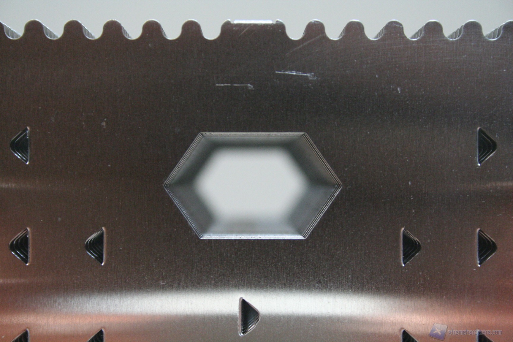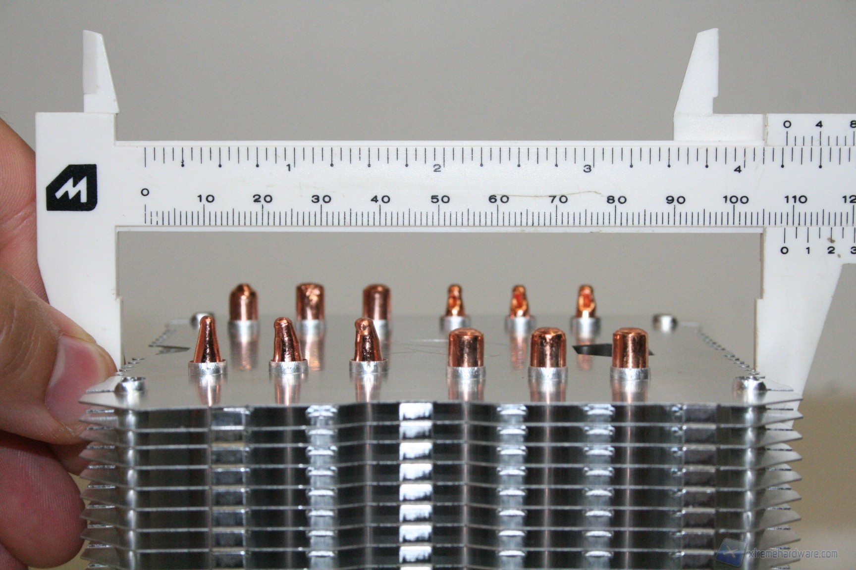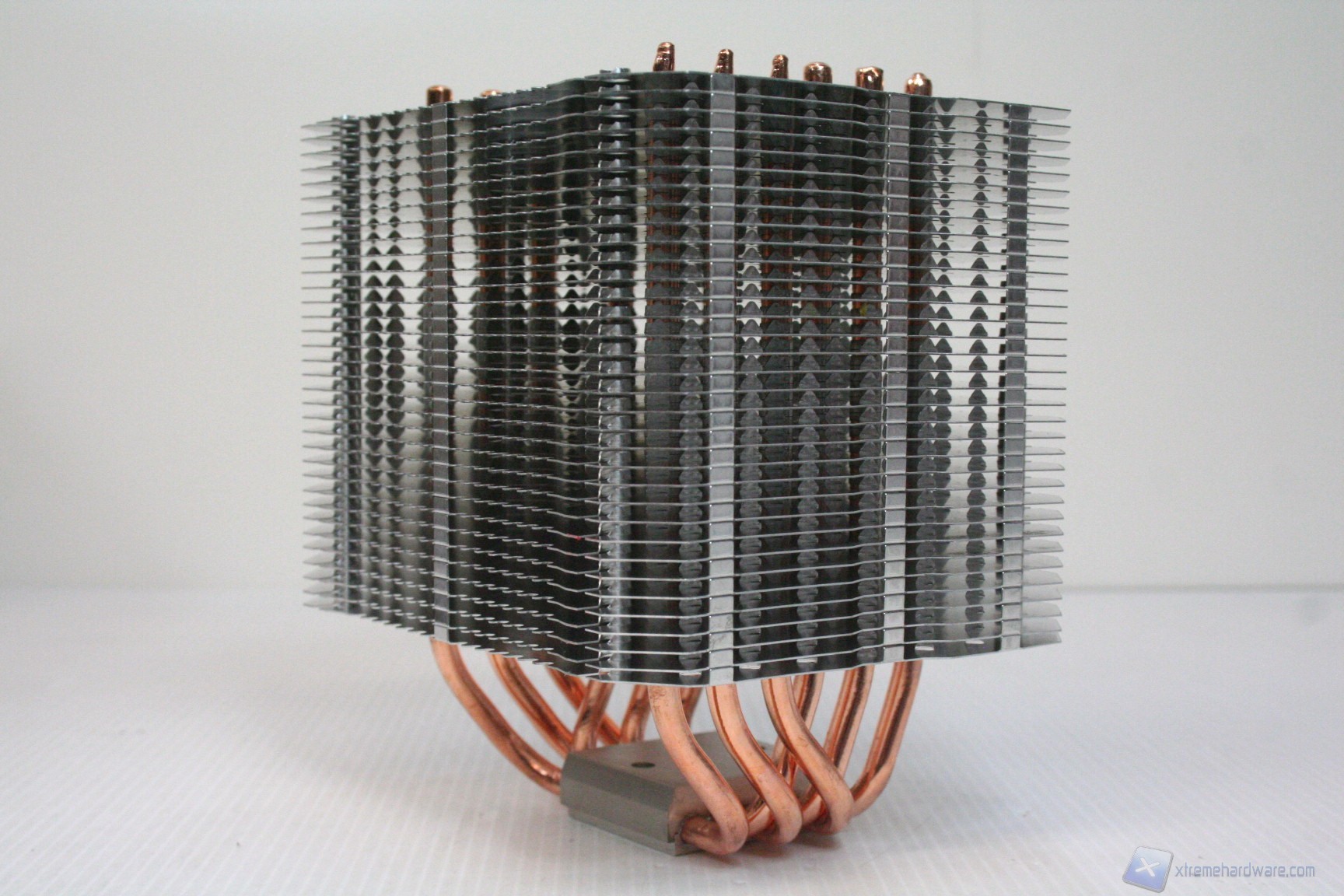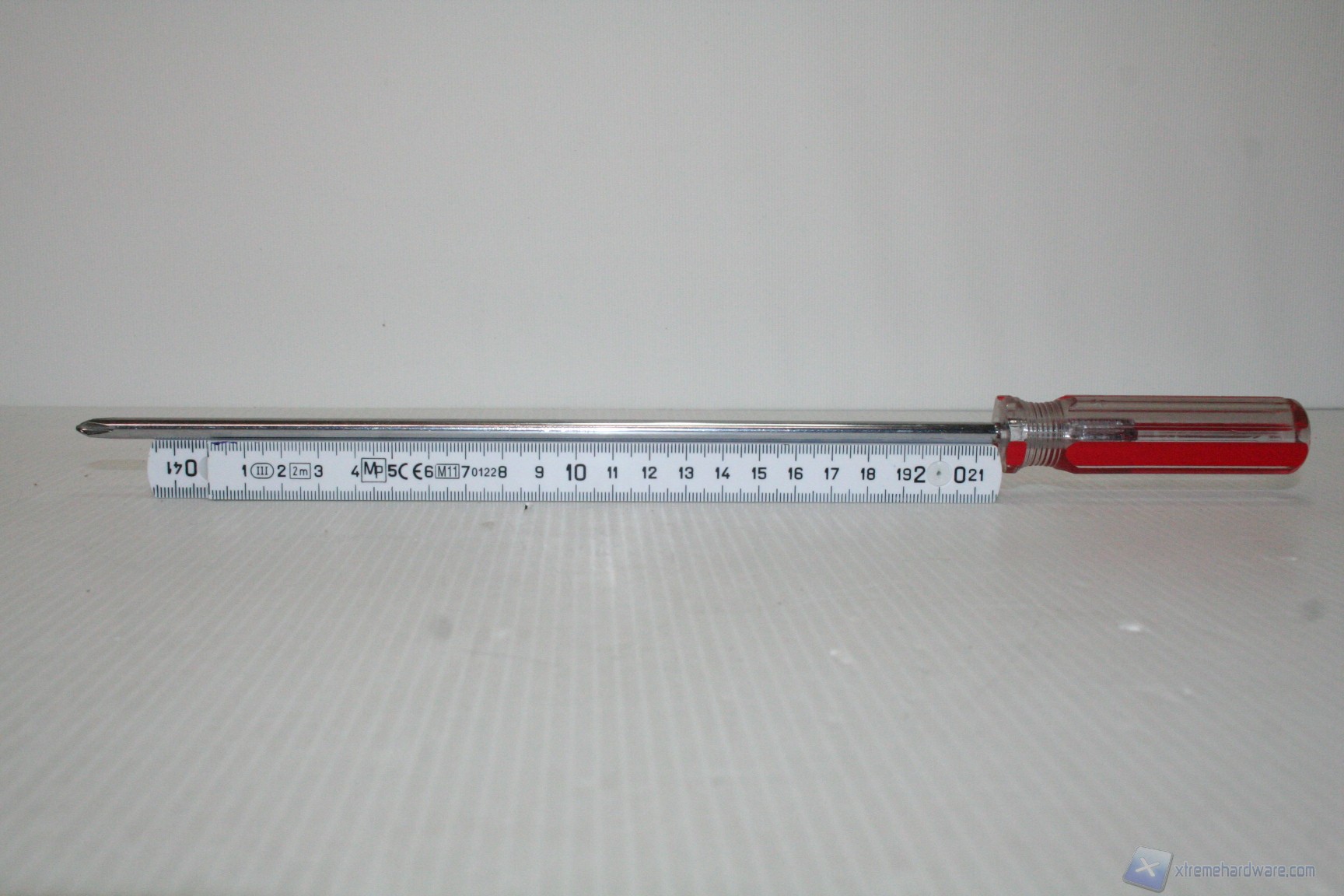 La struttura fa parte della classica tipologia a singola torre di raffreddamento, sebbene però in questo caso abbia una elevatissima profondità. E’ costituito da un unico corpo dissipante attraversato da 6 heatpipes ad “U” con diametro di 6mm, distribuite in fila lungo la direzione del flusso d’aria, quindi sovrapposte. Al centro sono presenti dei motivi che conferiscono un aumento della superficie dissipante (necessaria per migliorare il profilo di ventilazione interno in associazione alla zona morta di ventilazione, derivante dal diametro elevato del motore), ed anche due fori per l’installazione, uno dei quali all’interno dei plate sovrapposti, il che implica che per l’installazione sarà necessario un cacciavite a testa molto lunga. Vi mostriamo una fotografia del cacciavite che consigliamo di utilizzare:
