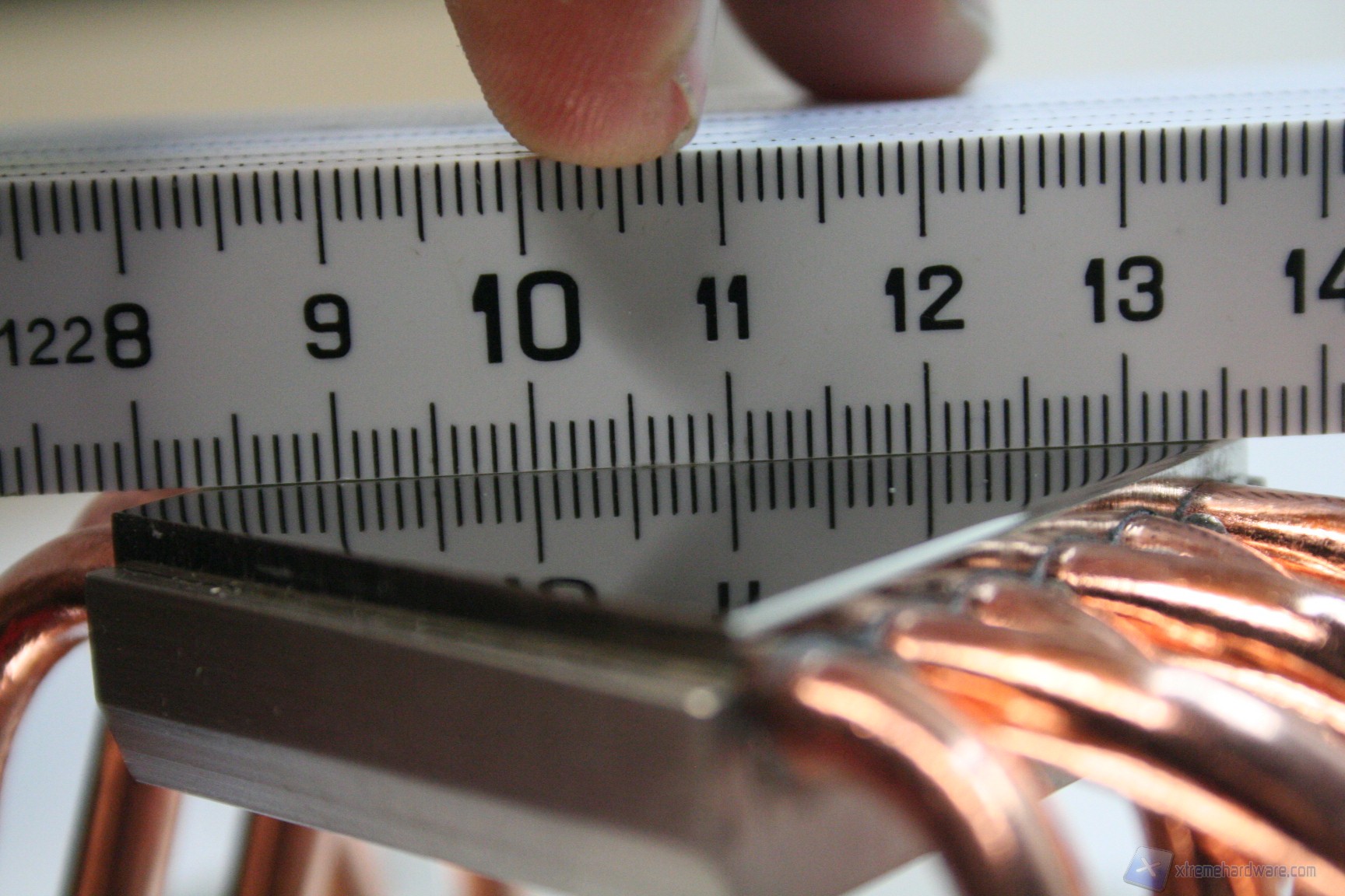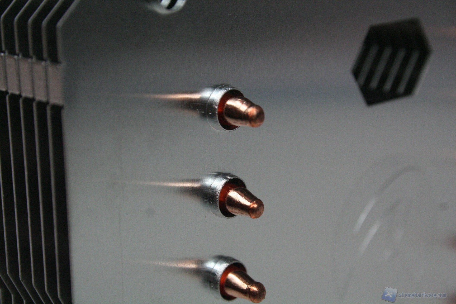 La base è leggermente convessa, ma di ottima qualità: è lappata a specchio, non sono presenti segni di lavorazione al tornio e le saldature con le heatpipe sono evidenti, quindi è una buona notizia. La base convessa non è consigliabile sul socket LGA 2011, in quanto il problema della deformazione a “banana” del socket non è più presente, al contrario del sistema 1155-56/1366, dove invece un minimo di convessità è consigliata.
