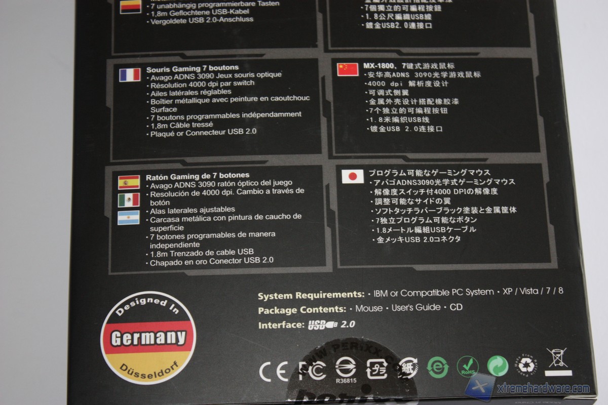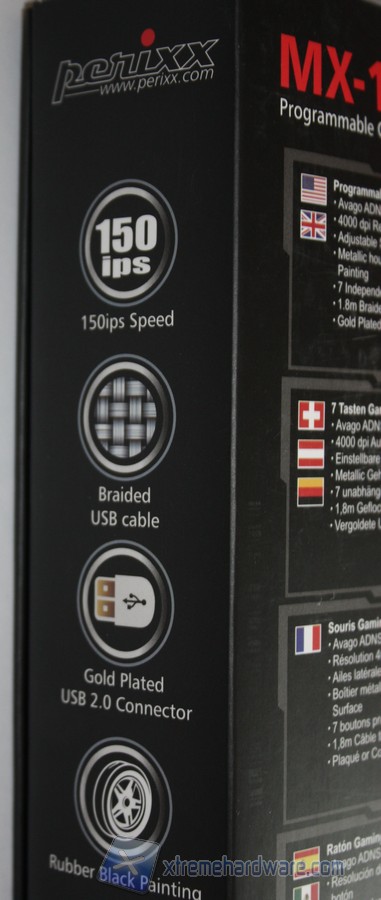 Tramite un’apertura a libro abbiamo la possibilità di visualizzare il prodotto all’interno della confezione. A lato troviamo invece un’ulteriore immagine illustrativa, in questo caso del modello in colorazione nera. Il Perixx MX-1800 è infatti disponibile in due colorazioni: nero e rosso.