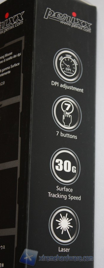 La parte frontale della confezione è caratterizzata da un’immagine illustrativa del prodotto, il modello del mouse ed il logo dell’azienda tutto su uno sfondo molto aggressivo. La scatola è di ridotte dimensioni ed è realizzata con il classico cartone non troppo rigido però.