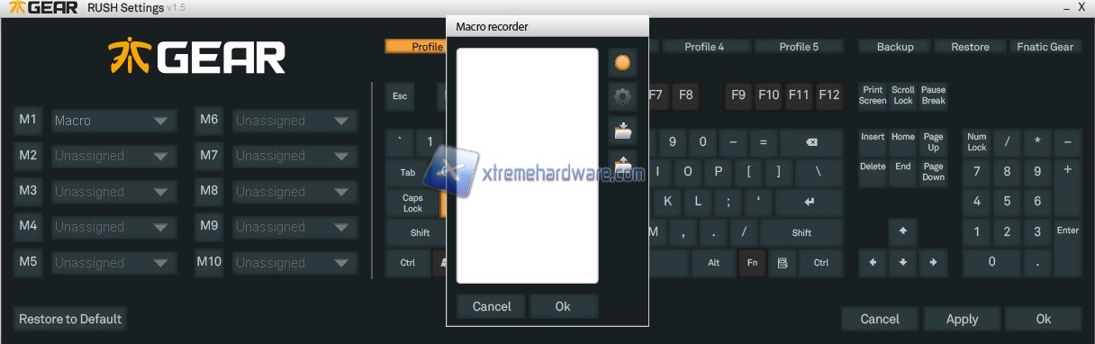 La GUI del software della tastiera RUSH è davvero semplice e immediata. Avremo una grafica personalizzata per il dato prodotto con tutti i riferimenti alla Fnatic Gear. Software inoltre diviso, se così possiamo dire, in due aree di cui a sinistra presente una sorta di tastiera con tasti virtuali denominati M1-M10 e a destra sempre una tastiera virtuale con tutti i singoli tasti fisici presenti sulla tastiera.