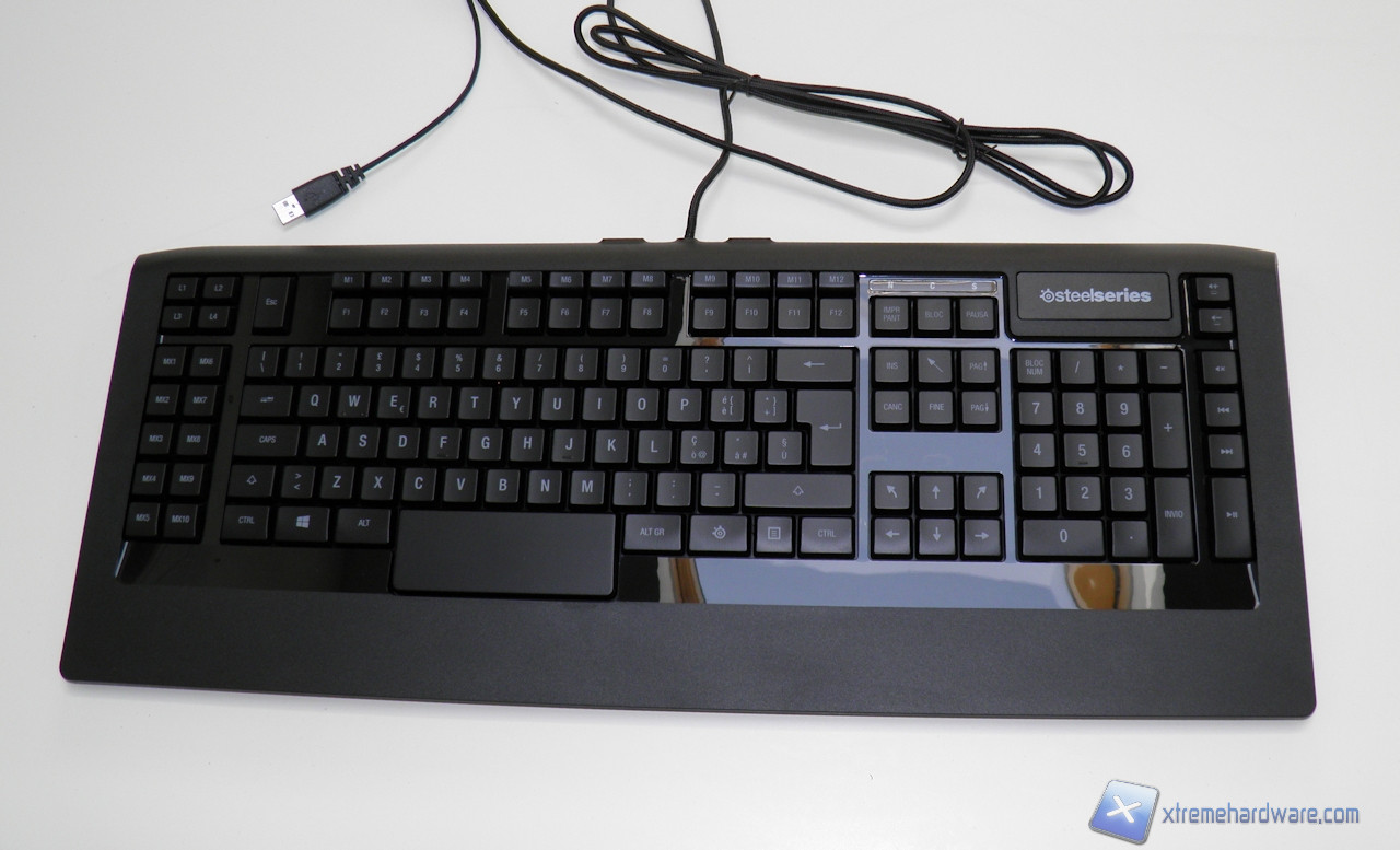 Estratta dalla confezione, rimaniamo impressionati dalle dimensioni e dal peso della Steelseries Apex. Grazie al design slim, la tastiera risulta particolarmente leggera, nonostante le dimensioni siano superiori a quelle di una tastiera standard.