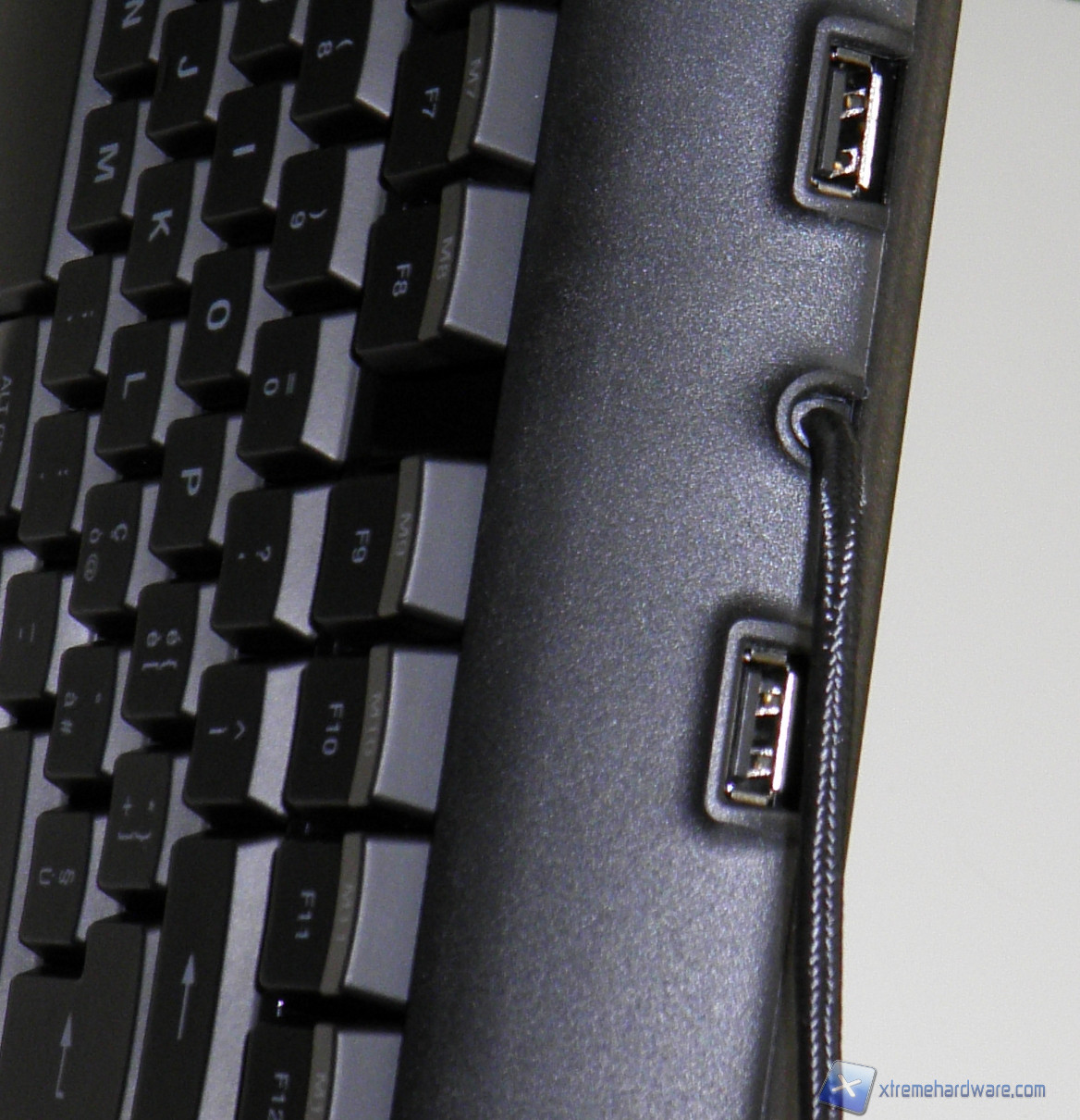 Nella parte posteriore sono situate due porte USB 2.0, mentre la parte inferiore risulta insolita e priva di piedini per regolarne l'inclinazione. Steelseries non ha tuttavia escluso la possibilità di regolare l'altezza della Apex: troviamo, infatti, dei piedini in gomma dal profilo rialzato da sostituire a quelli installati di serie.