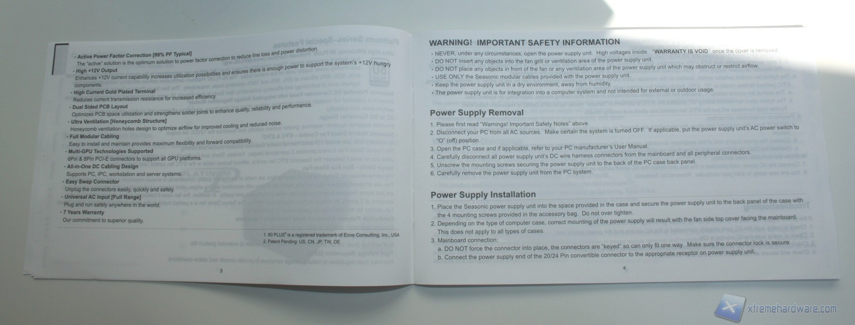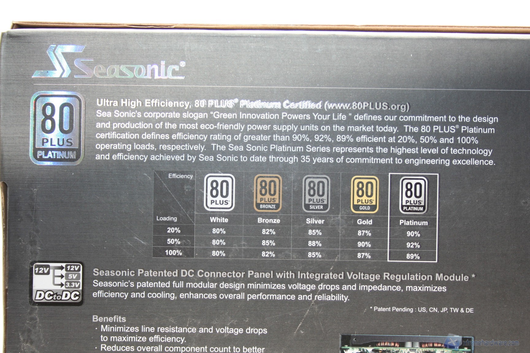 La confezione esterna è di medie dimensioni, dal layout decisamente ordinato, pulito ed elegante, sia nell’esposizione delle informazioni, che sono in gran numero e molto approfondite, sia nell’organizzazione interna delle componenti. La colorazione è grigio-azzurrina, con decalcomanie riflettenti la luce. Nella parte posteriore della confezione si può già apprezzare la qualità dei componenti adottati da Seasonic per questa soluzione, grazie a una fotografia interna del layout del PCB e delle componenti onboard con annessa spiegazione.