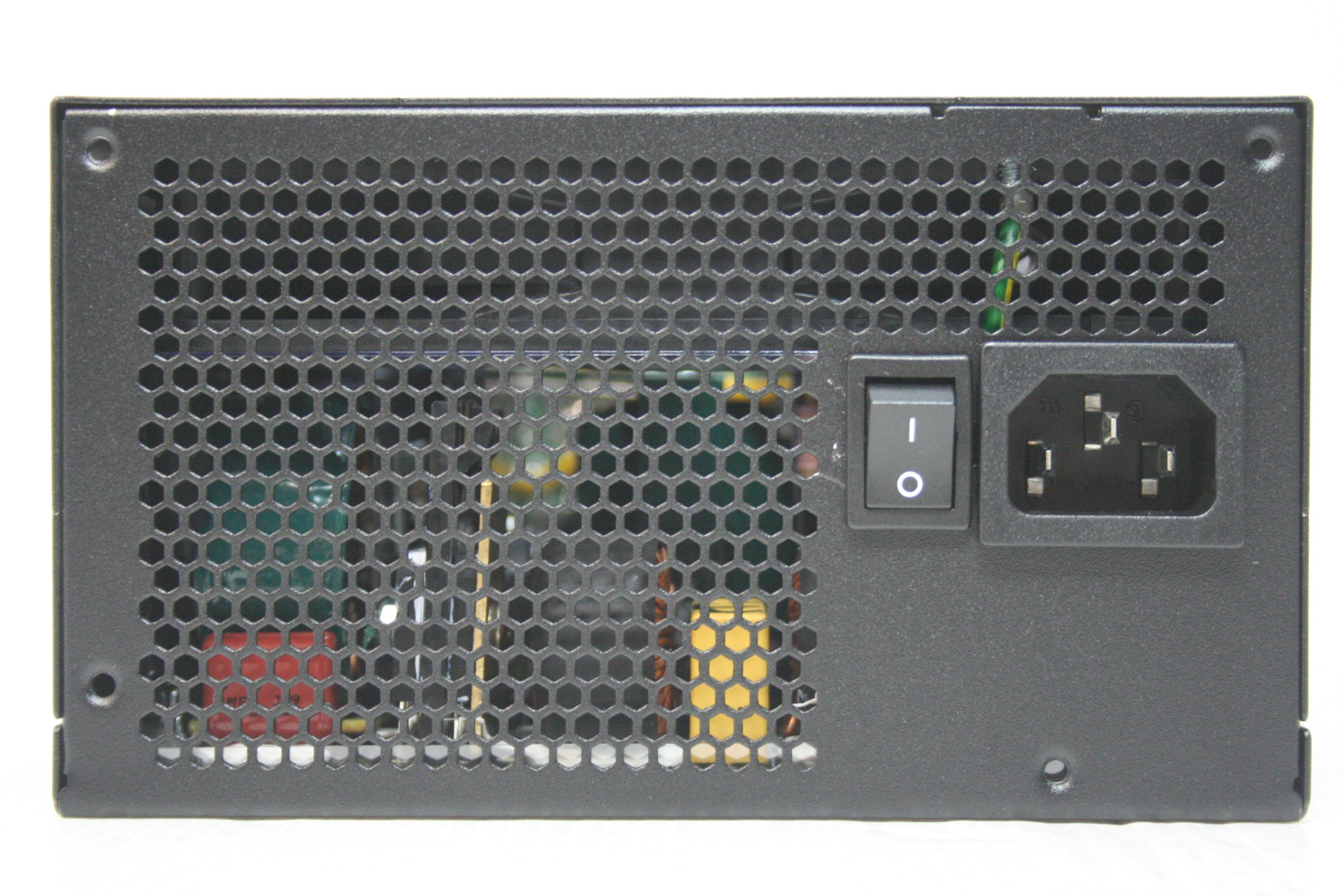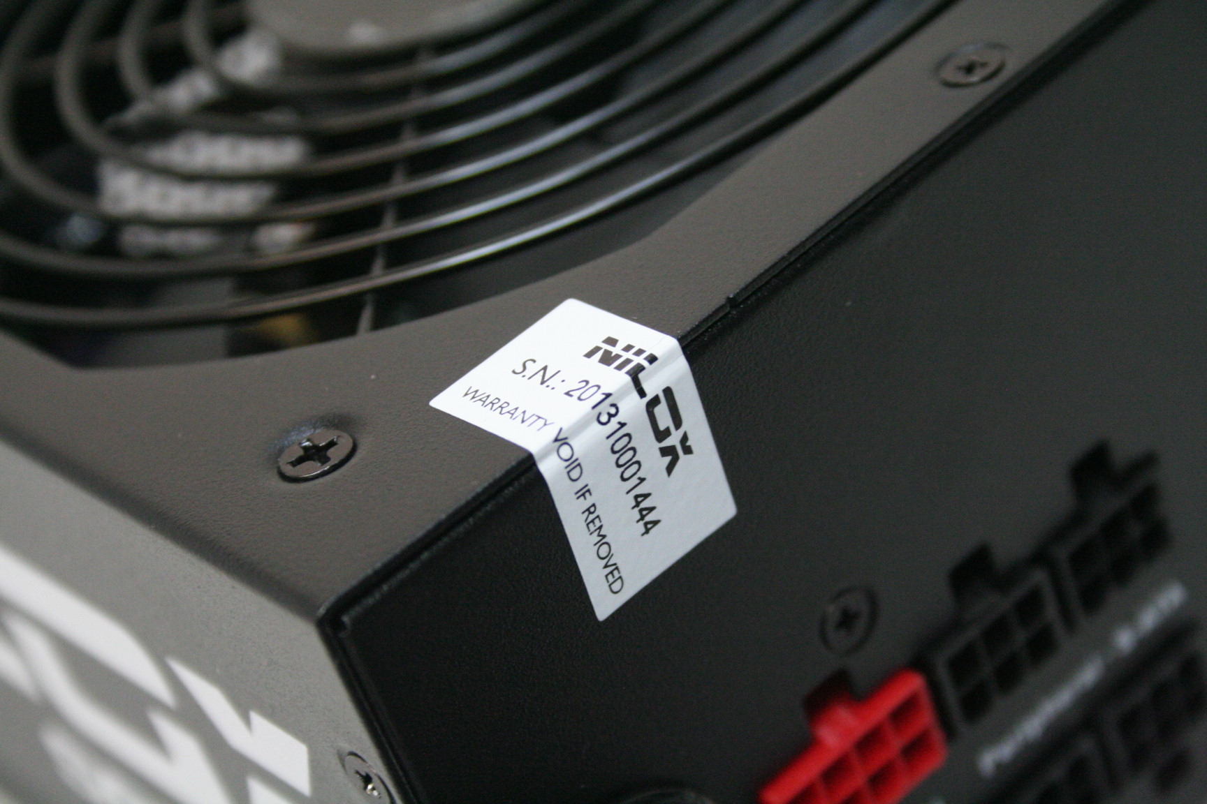 Lateralmente, in alto, c’è uno sticker che segnala la perdita della garanzia della casa produttrice qualora dovesse essere rimosso o forato, per permettere lo smontaggio della scocca, cosa presente nella quasi totalità degli alimentatori attualmente in commercio. Posteriormente sono presenti invece le classiche fessure d’aerazione, esagonali a nido d’ape assieme all’ingresso della corrente.