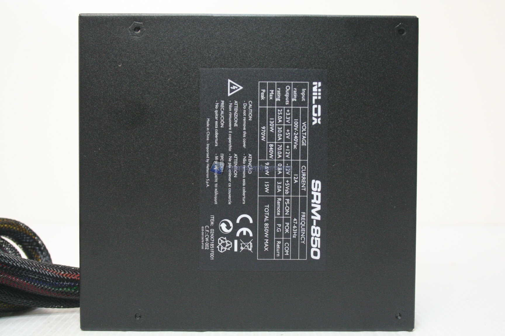 Analizzando brevemente il telaio esterno possiamo dire che è abbastanza standard. Posteriormente troviamo le connessioni semi-modulari, ripartite per colore (in Rosso le PCI-E). Il connettore di alimentazione in ingresso ha lo standard C14, quindi di dimensioni classiche ed il pulsante similmente non differisce dallo standard. La ventola utilizzata è da 140mm ed è un modello di un notissimo produttore, presente quindi in alimentatori di fascia Enthusiast, come vedremo nei prossimi capitoli. Lo sticker superiore rende impossibile la lettura delle specifiche all’interno del cabinet quindi sarebbe opportuno posizionarlo al lato destro, proprio dove troviamo il logo Nilox. La verniciatura è ottima e non sono presenti sbavature od imperfezioni.