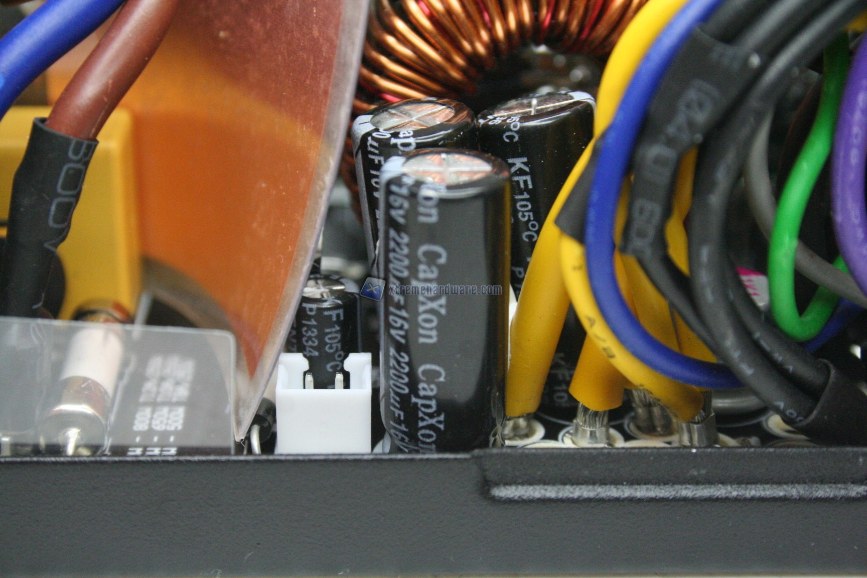NOTA GENERICA: i condensatori del circuito primario agiscono come buffer e sono molto importanti perché la loro presenza aiuta a proteggere il nostro alimentatore ed il computer stesso da pericolosi sbalzi di tensione e generalmente vengono collegati in parallelo al fine di sommare le singole capacità o, alternativamente, per modelli meno potenti. La tipologia dei condensatori utilizzata è quindi molto importante perché la vita di queste componenti si dimezza in base all’aumento della temperatura di ogni 10 gradi Celsius, sotto un normale carico di lavoro; questo significa che utilizzando modelli di condensatori capaci di gestire, senza il minimo problema anche 105 gradi Celsius, la durata della loro vita potrebbe essere addirittura pari al doppio rispetto a modelli standard da 85 gradi Celsius! Questo fattore è uno dei più sponsorizzati nel campo degli SMPS, non a caso ci si vanta della presenza di condensatori giapponesi nella propria unità, capaci appunto di sopportare temperature maggiori e quindi prolungare la vita stessa dell’unità.