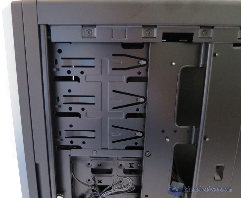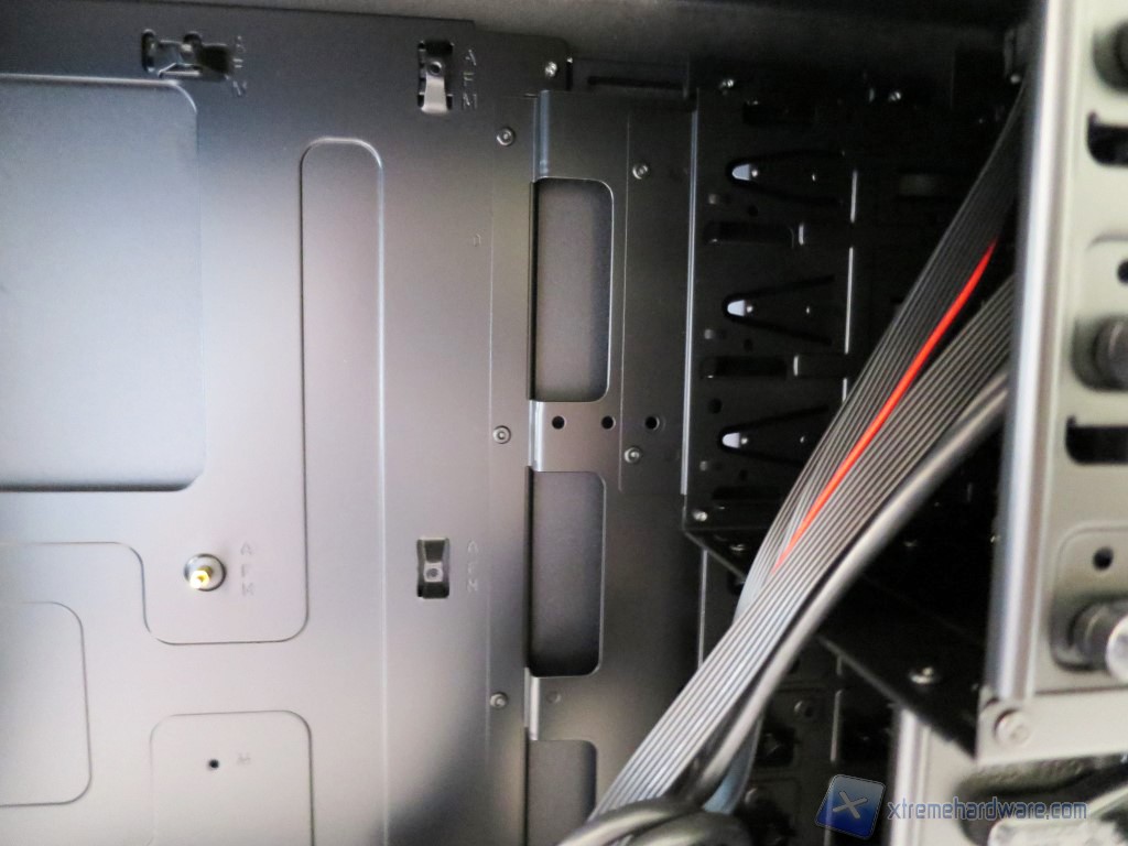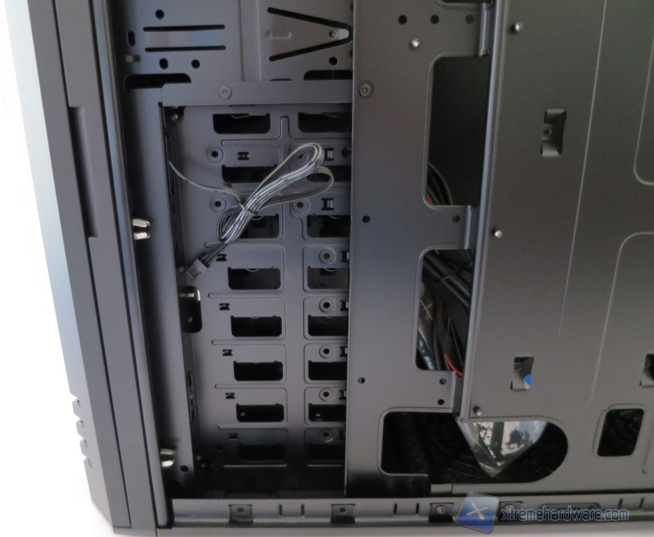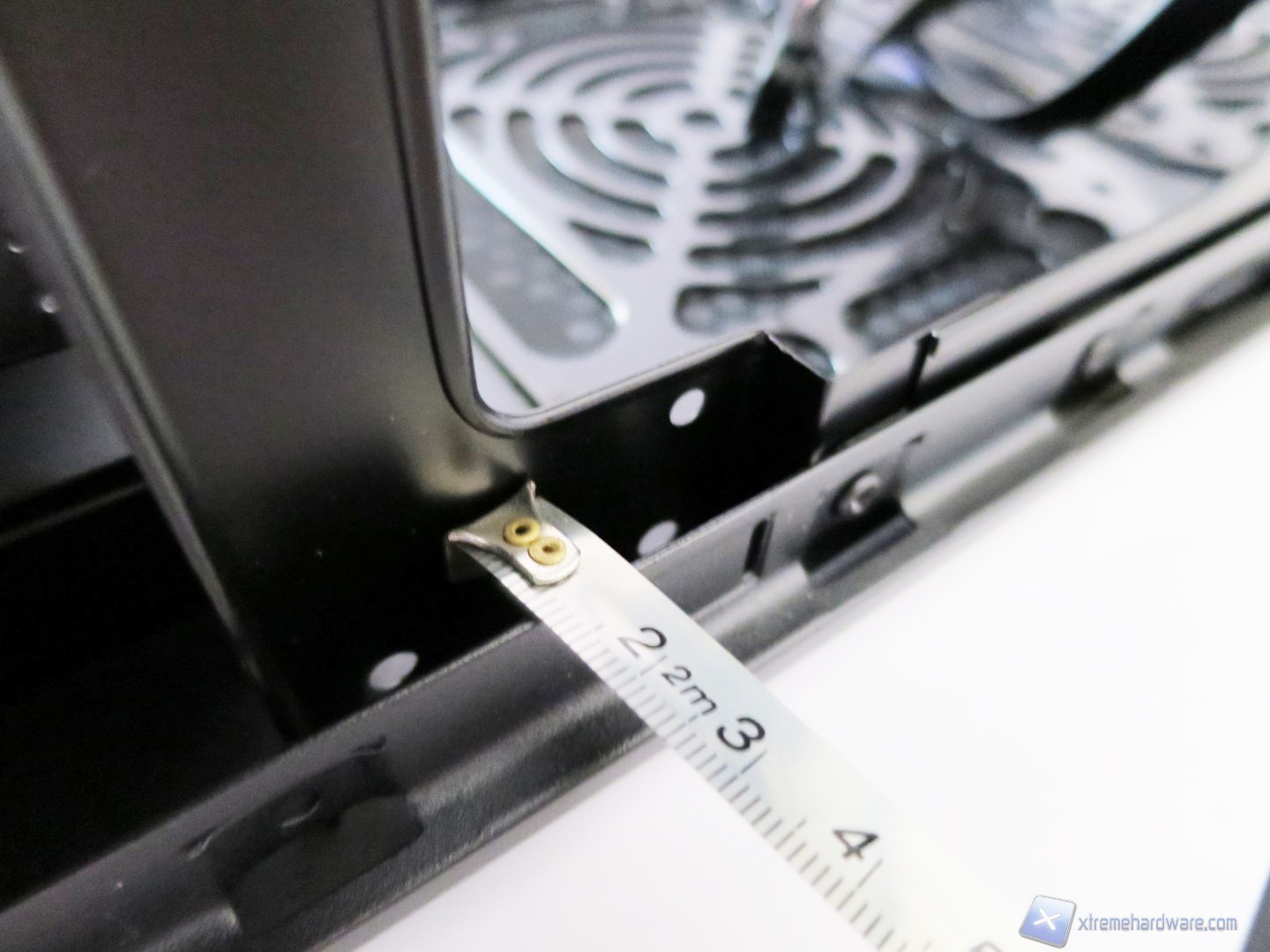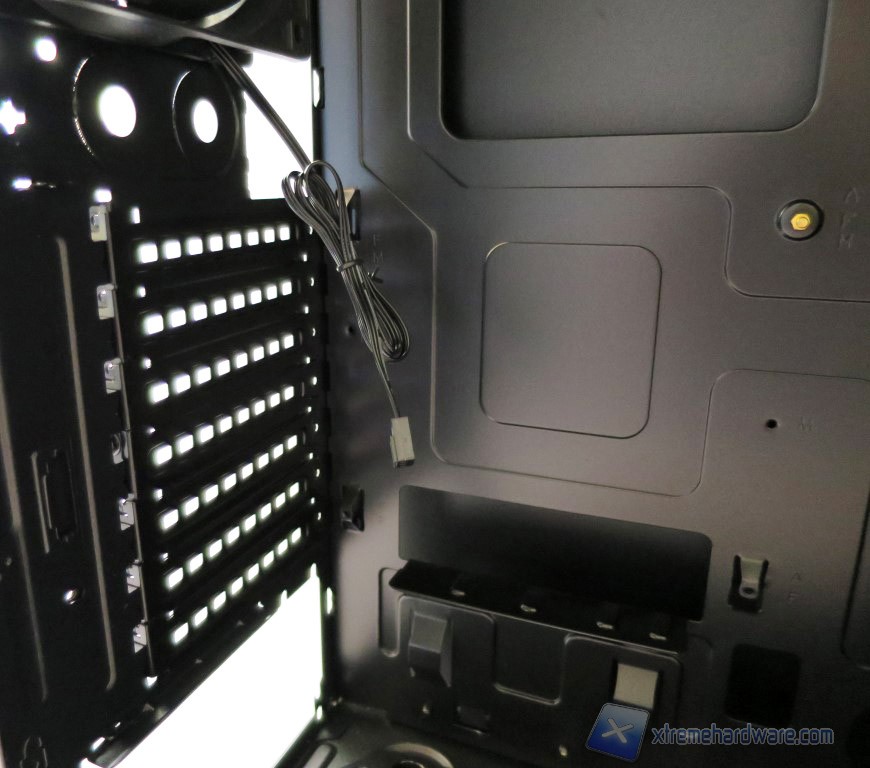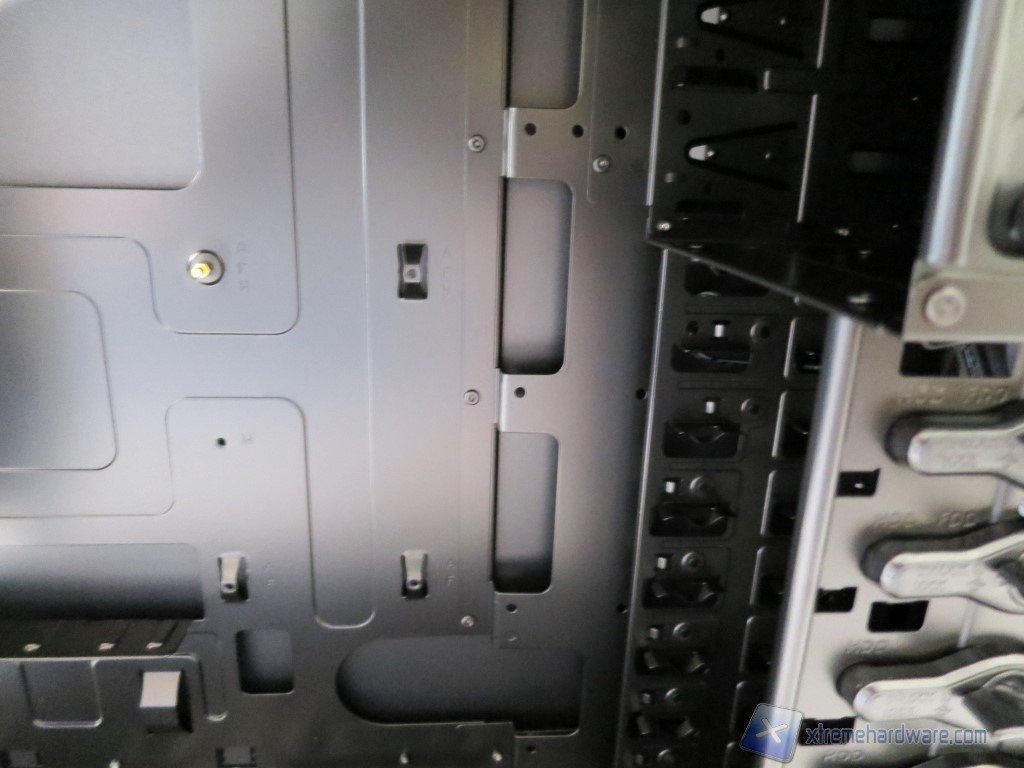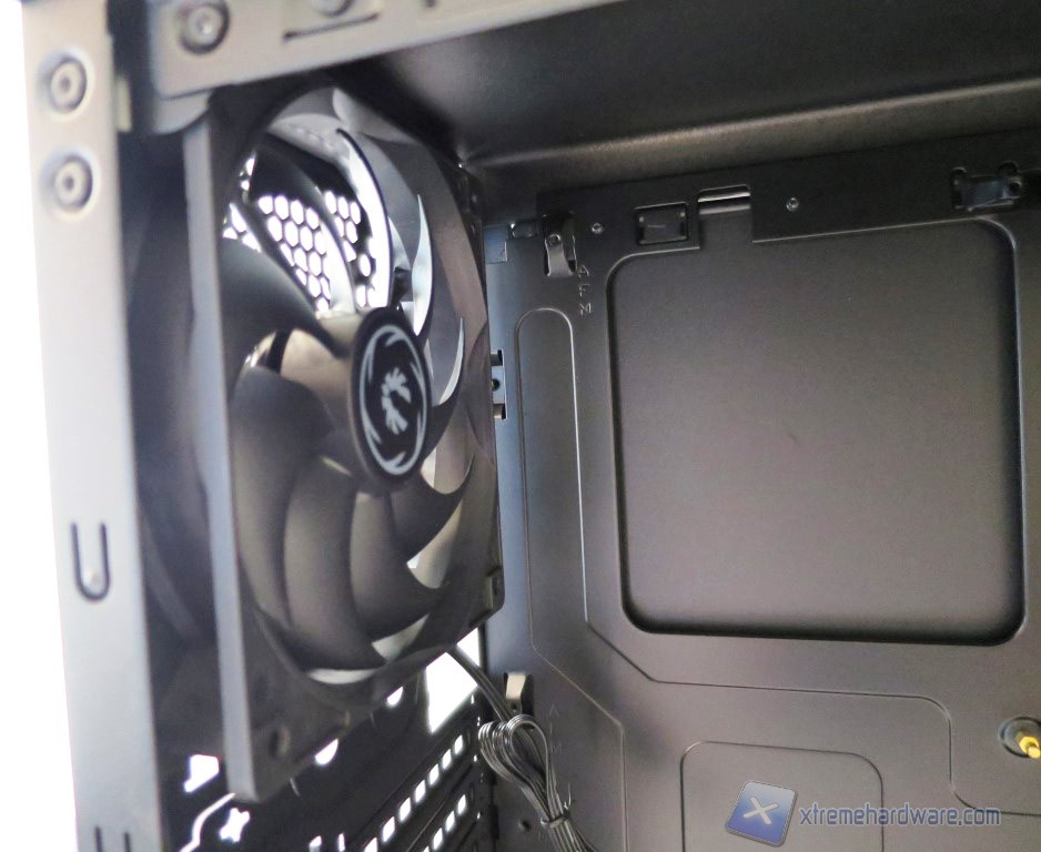 Il piatto della scheda madre è interamente in SECC. Intorno ad esso sono presenti alcuni fori per il passaggio dei cavi dell’alimentatore. Notiamo come nella parte alta sinistra nel ritaglio per il foro del dissipatore sia presente un ulteriore intaglio che ci permetterà di far passare (prima di installare la scheda madre) il cavo 8pin EPS. Nella parte destra troviamo invece vari fori che permetteranno di far passare eventuali cavi SATA e di alimentazione. I fori non sono rivestiti della classica gomma ma hanno una buona dimensione adatta a far passare anche cavi sleevati singolarmente. Inoltre le dimensioni di circa 2 centimetri nella parte posteriore al piatto della scheda madre permettono di gestire in maniera adeguata il relativo cable management. Nella parte posteriore notiamo un ampio foro per il dissipatore ed il relativo backplate ma come noteremo nel capitolo dell’installazione tale foro non è centrato per cui non potrà essere sfruttato in modo adeguato (almeno con la nostra configurazione). Lo spazio all’interno del BitFenix Shadow è adeguato all’installazione di un sistema dissipato ad aria e in totale potremo installare quattro ventole.