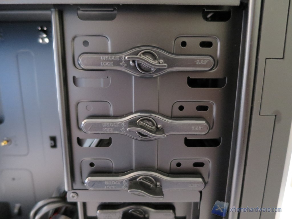 Sopra alla gabbia per gli SSD ed Hard Disk troviamo gli slot da 5,25’’ dotati del classico sistema Tool-less per l’installazione. Ci basterà ruotare il perno in plastica in senso antiorario per sbloccare e riportarlo in posizione per bloccare l’unità una volta installato.