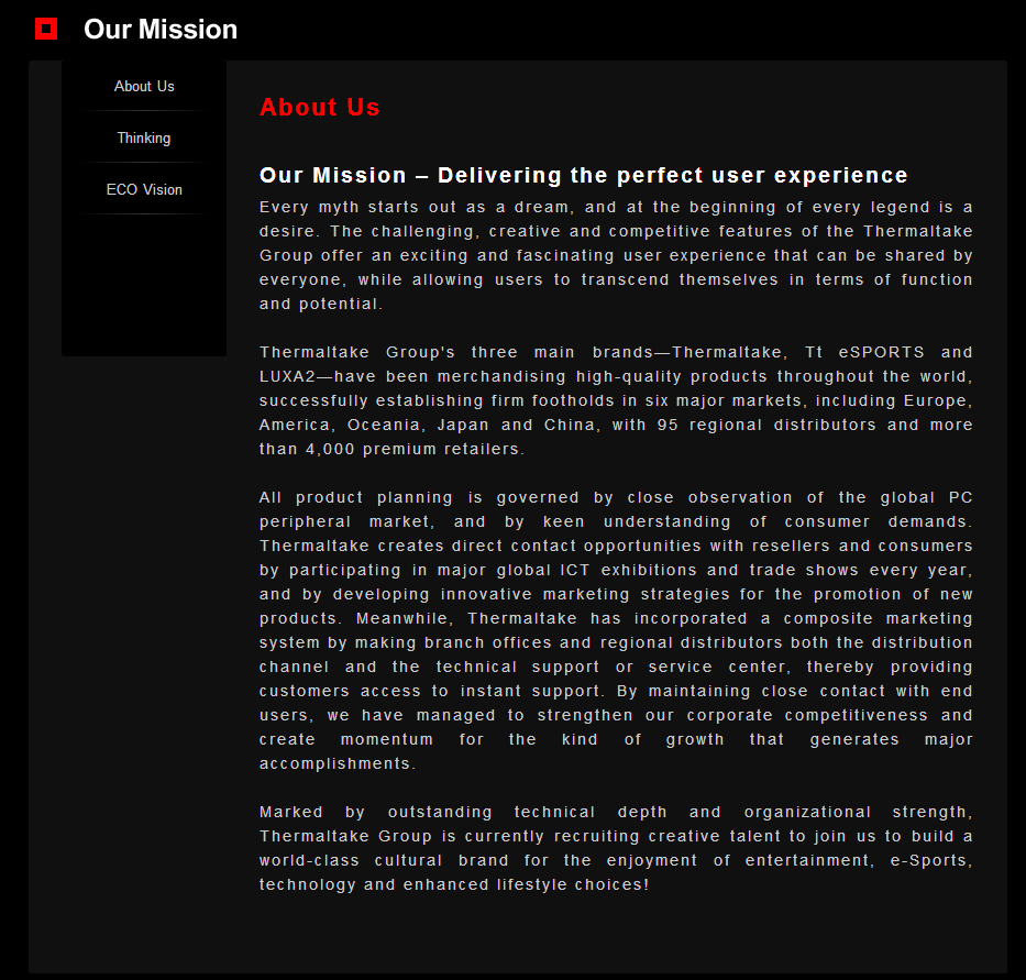 Thermaltake è uno tra i principali produttori nel mercato ICT a livello mondiale. Possiede tre brand principali tra cui Thermaltake, Tt eSPORTS e LUXA2, i cui canali di distribuzione sono presenti in Europa, America, Oceania, Giappone e China, con un totale di 95 distributori regionali ed oltre 4000 negozianti sul territorio.