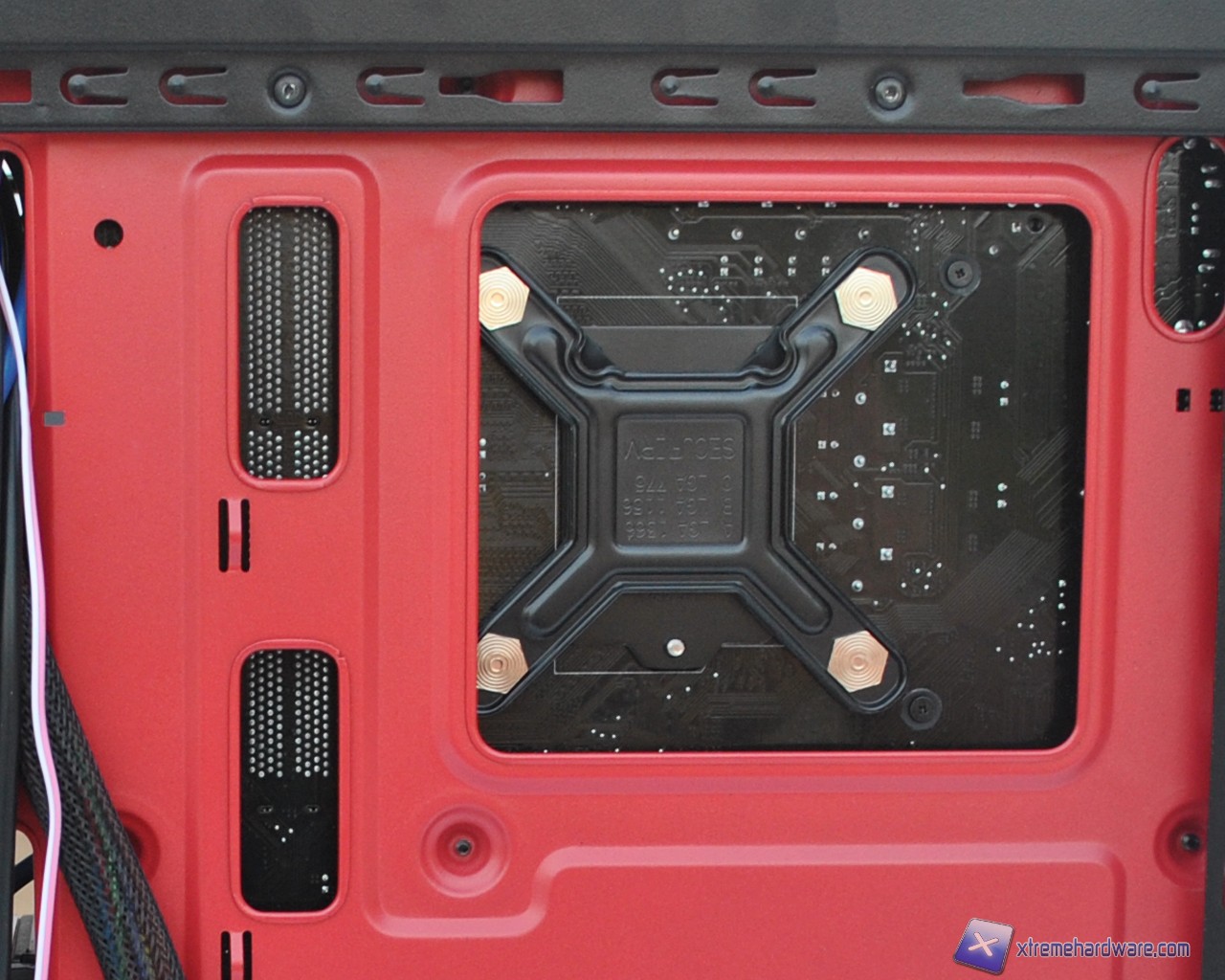 Il vassoio della scheda madre permette l'installazione di mainboard ATX e mATX, è dotato di una apertura piuttosto ampia per accedere eventualmente al backplate del dissipatore CPU e ci sono anche molti fori utili per il passaggio dei cavi, è un peccato però che non siano dotati di guarnizioni in gomma utili ad ottenere un cablaggio ancor più lineare.