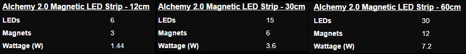 Dalle tabelle possiamo notare dunque i colori disponibili a cui ora è stata aggiunto il viola in sostituzione del colore e modello arancione presente nella precedente versione Alchemy. Inoltre i LED SMD presenti nelle nuove Alchemy 2.0 sono stati tarati nuovamente in modo tale da avere un colore più luminoso e “corposo”. Anche la lunghezza è stata leggermente aumentata passando dai 50cm delle precedenti Alchemy a 60cm nel modello più lungo per le Alchemy 2.0. Ciò permetterà di coprire una maggiore superficie anche e quando combineremo diverse strisce tra di loro. Inoltre la vera novità delle Alchemy 2.0 è sicuramente il nuovo sistema di aggancio che grazie a magneti inseriti nella struttura delle strip permetterà di installarle più facilmente. Nel modello ricevuto, ovvero quello con una lunghezza di 30cm, troveremo ben 6 magneti.