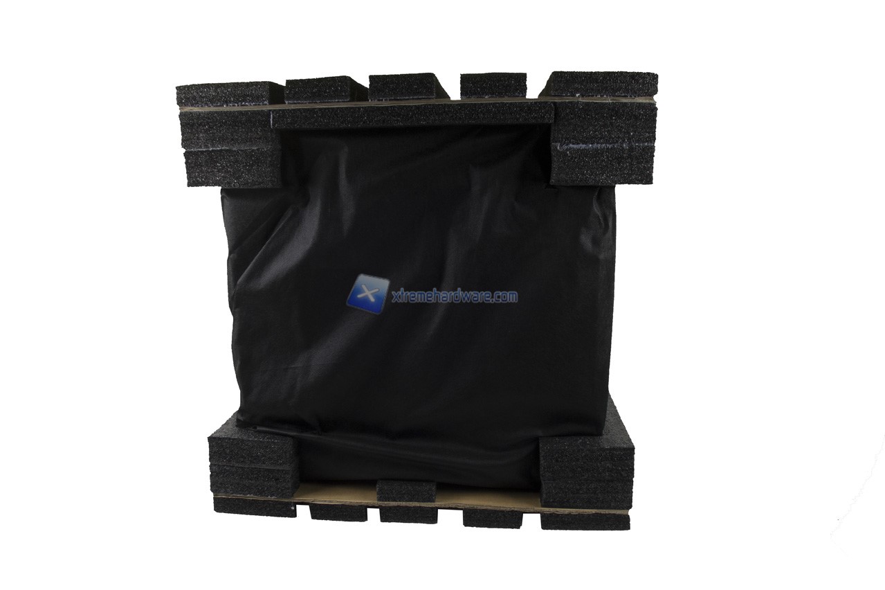 Una volta aperta la confezione ed estratto possiamo notare come il case sia ospitato non solo in un telo di colore nero ma anche sorretto da due robuste e generose sagoma di gomma espansa e cartone. Ciò a garantire l’integrità durante il trasporto.