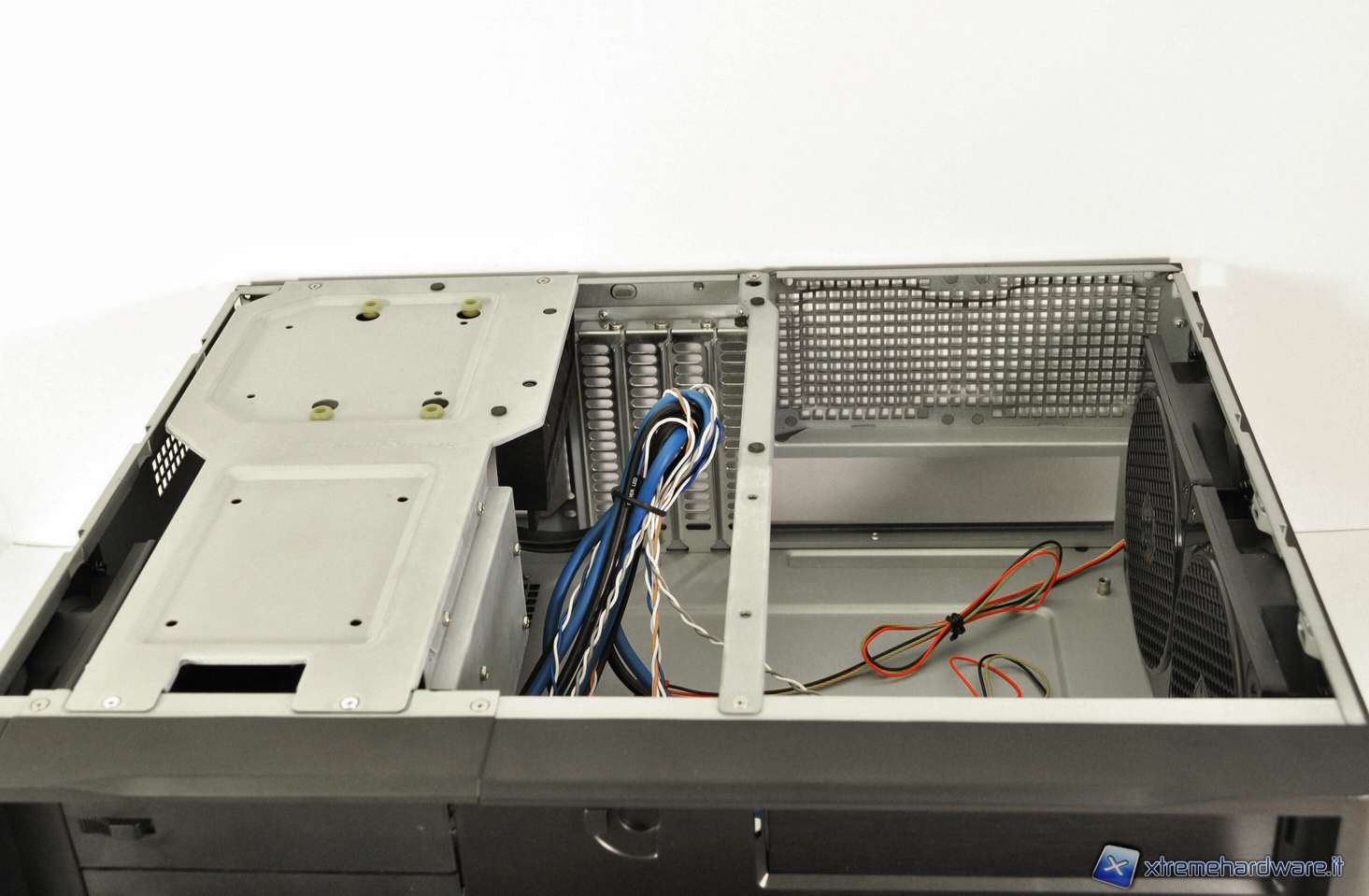 Nella parte posteriore della staffa è presente un divisorio in gomma disegnato per convogliare il flusso d’aria verso le ventole poste sul pannello superiore. Quest’ultimo è dotato di flap che possono essere rimossi per creare ulteriore spazio per facilitare il passaggio dei cavi.