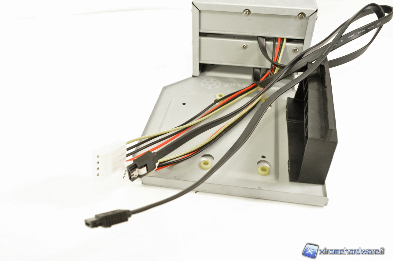 Una volta tolto il coperchio sul tetto ecco come si presenta internamente il nostro case. Possiamo notare principalmente due cose: il vano che ospita il lettore da 5.25’’ e il vano che ospita gli hard-disk hot Swap e tradizionali.  Nelle due immagini di seguito è possibile vedere il cassetto degli hard-disk hot-swap in dettaglio. Si può notare i cavi SATA sul retro da collegare alla scheda madre e i molex a 4 pin.