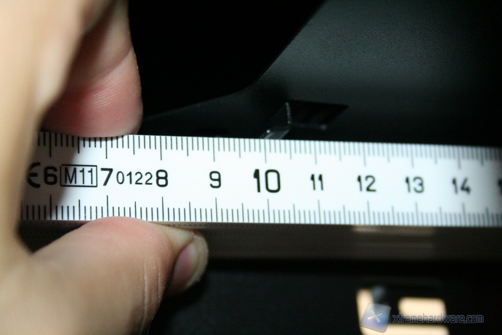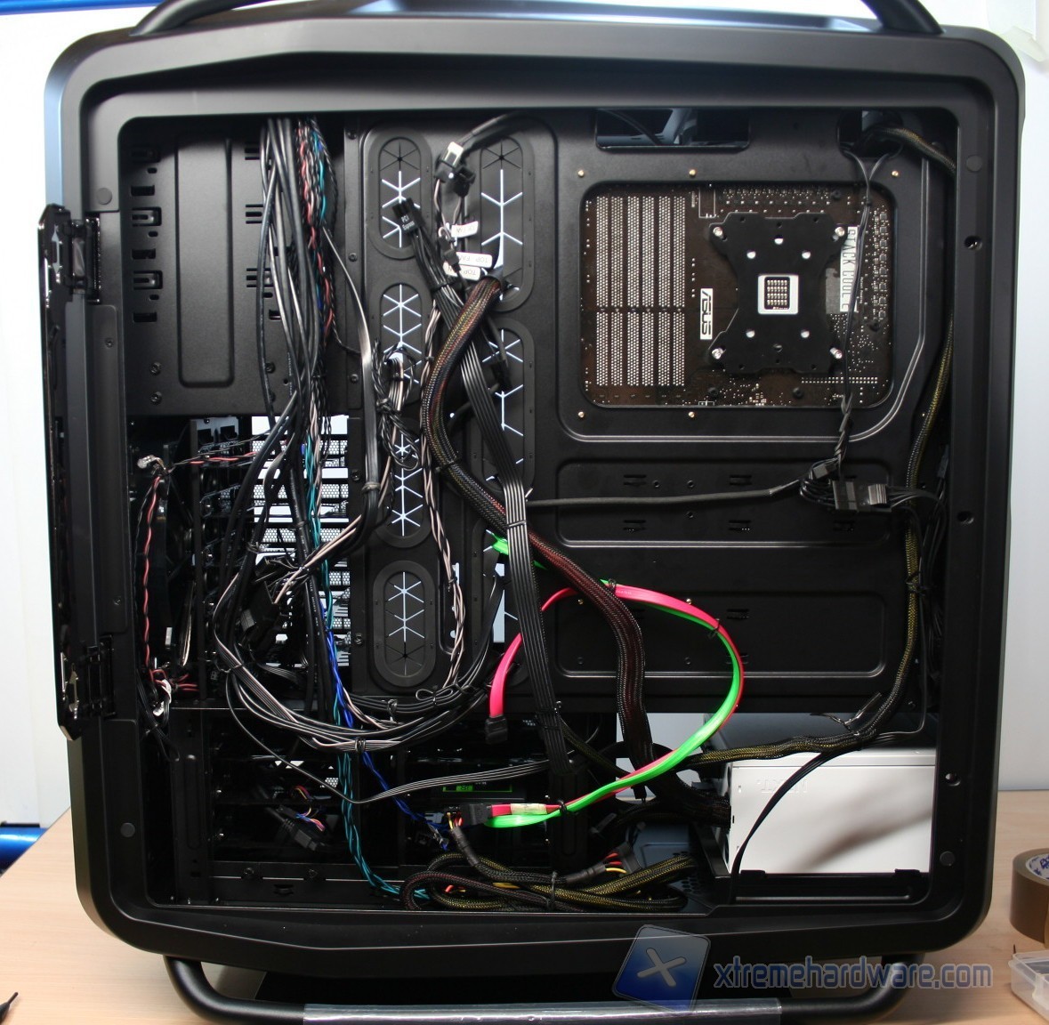 Fatto questo, e bloccato il lettore tramite il sistema di blocco laterale, si richiude il pannello frontale e si passa all’installazione della scheda madre. Se si possiede un dissipatore Intel, tramite il solito sistema push-pin, sarà possibile installarlo successivamente, altrimenti se volete potete già procedere ad installare il backplate del dissipatore della CPU, facendo attenzione a stendere un sottile velo di pasta termica alla base della CPU stessa. In sostanza, se la vostra scheda madre non è mini-ITX, dovrete prima montare i distanziatori nei fori per il formato ATX, serrarli molto bene – consigliamo una pinza larga 1cm durante quest’operazione, su ogni cabinet – e poi apporre la scheda madre, serrandola con le viti fornite nella confezione. Se avete un dissipatore aftermarket potete utilizzare il foro posteriore, che è molto pratico e vi aiuterà non poco all’atto della procedura. Dopo aver montato il dissipatore sulla scheda madre, sarà necessario montare la scheda video, le RAM ed infine procedere all’assemblaggio dei cavi di connessione del cabinet alla scheda madre. Per fare un lavoro pulito consigliamo l’utilizzo delle fascette restringenti fornite in bundle. Giusto a titolo informativo riportiamo il cablaggio eseguito posteriormente, ma state certi che con una maggiore cura ed attenzione ai particolari il lavoro sarà ancora migliore. Terminata l’operazione vi consigliamo di connettere tutte le ventole che avete a disposizione. Mostriamo alcune fotografie di compatibilità per i radiatori:
