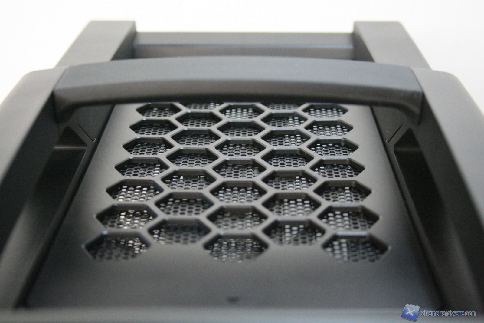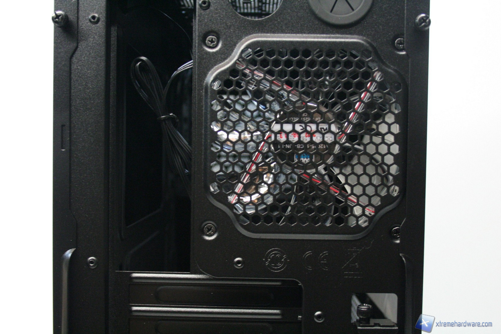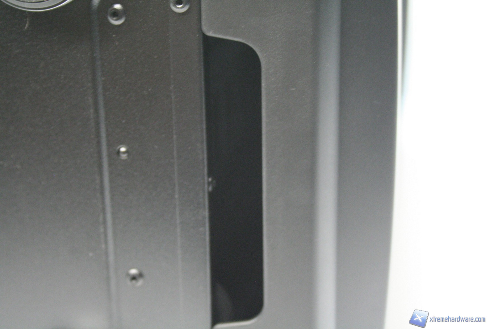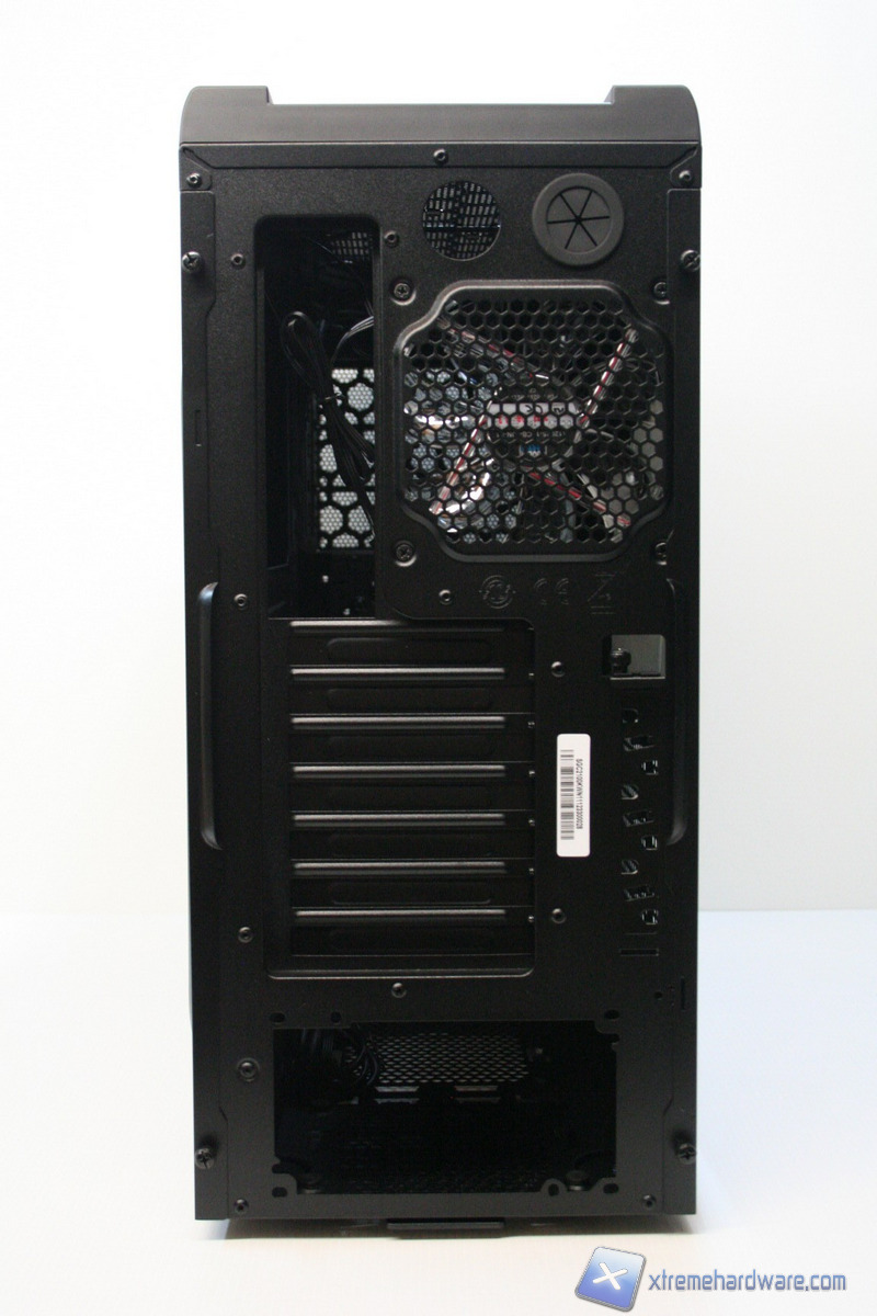 Posteriormente abbiamo una configurazione classica, con alimentatore nella parte inferiore, 7 slot di espansione PCI che non presentano nessuna apertura d’aerazione, due piccole fessure per l’installazione di tubazioni a liquido nella parte superiore, la predisposizione per una ventola da 120mm ed infine è presente un sistema laterale di passaggio e bloccaggio dei cavi, che permette di non far rimuovere periferiche dall’esterno. Tale sistema, posizionato accanto agli slot PCI è denominato Storm Guard ed è particolarmente utile durante i LAN Party poiché impedisce il furto di periferiche quali mouse, tastiera ed headset. Utilizzando tale accorgimento, sarà necessario aprire il pannello laterale per poter estrarre il connettore dal cabinet. Lo spessore del cabinet in questa zona è modesto, ma la presenza di bombature su entrambe le paratie facilita l’installazione di dissipatori voluminosi e il cablaggio posteriore.