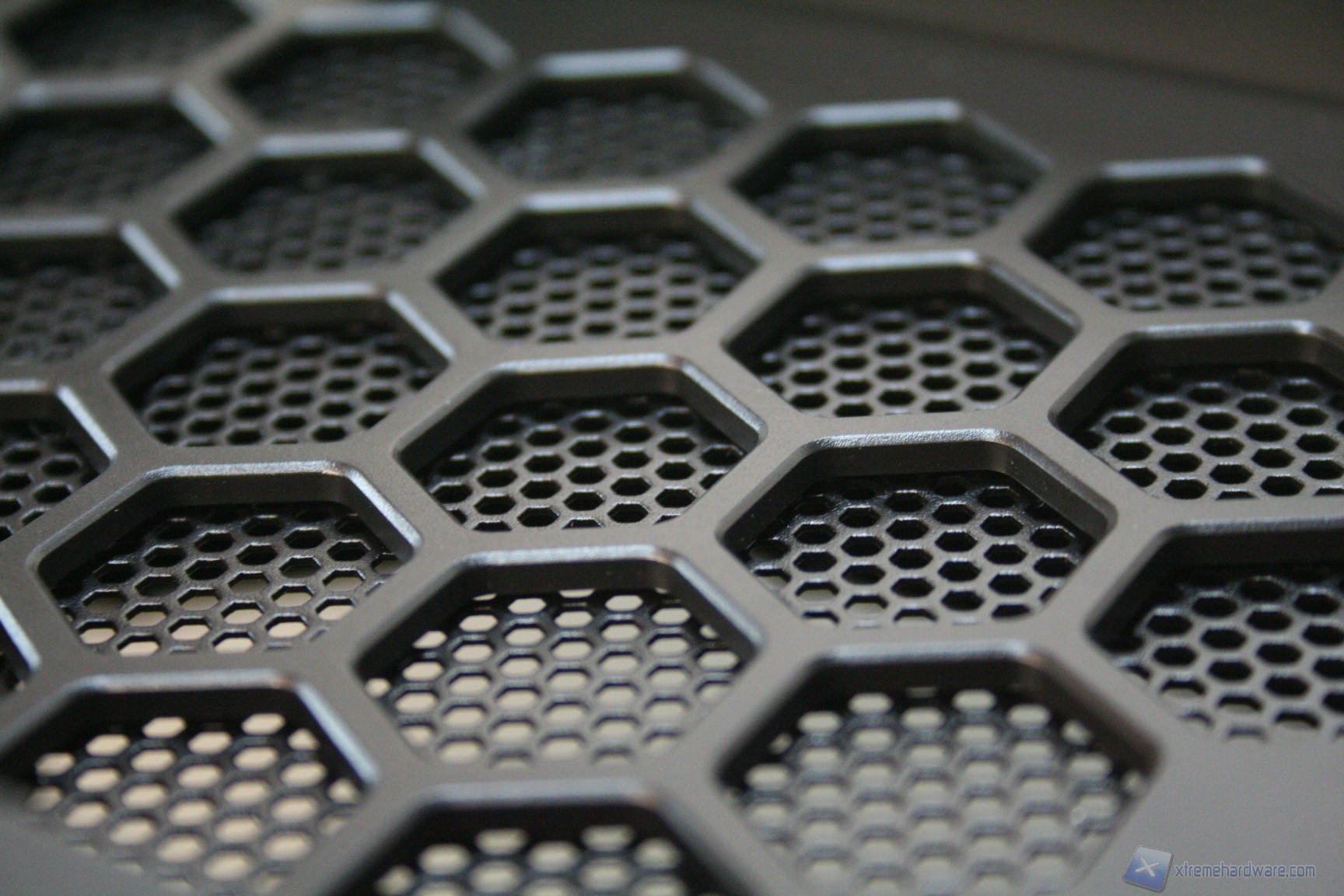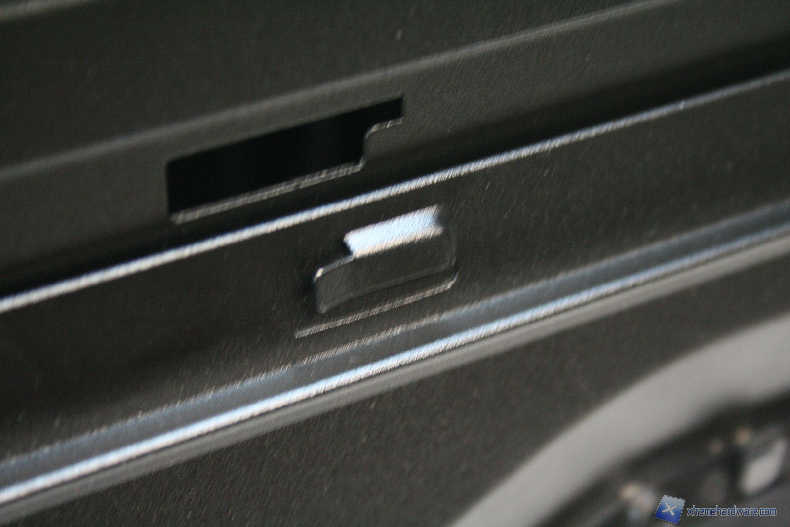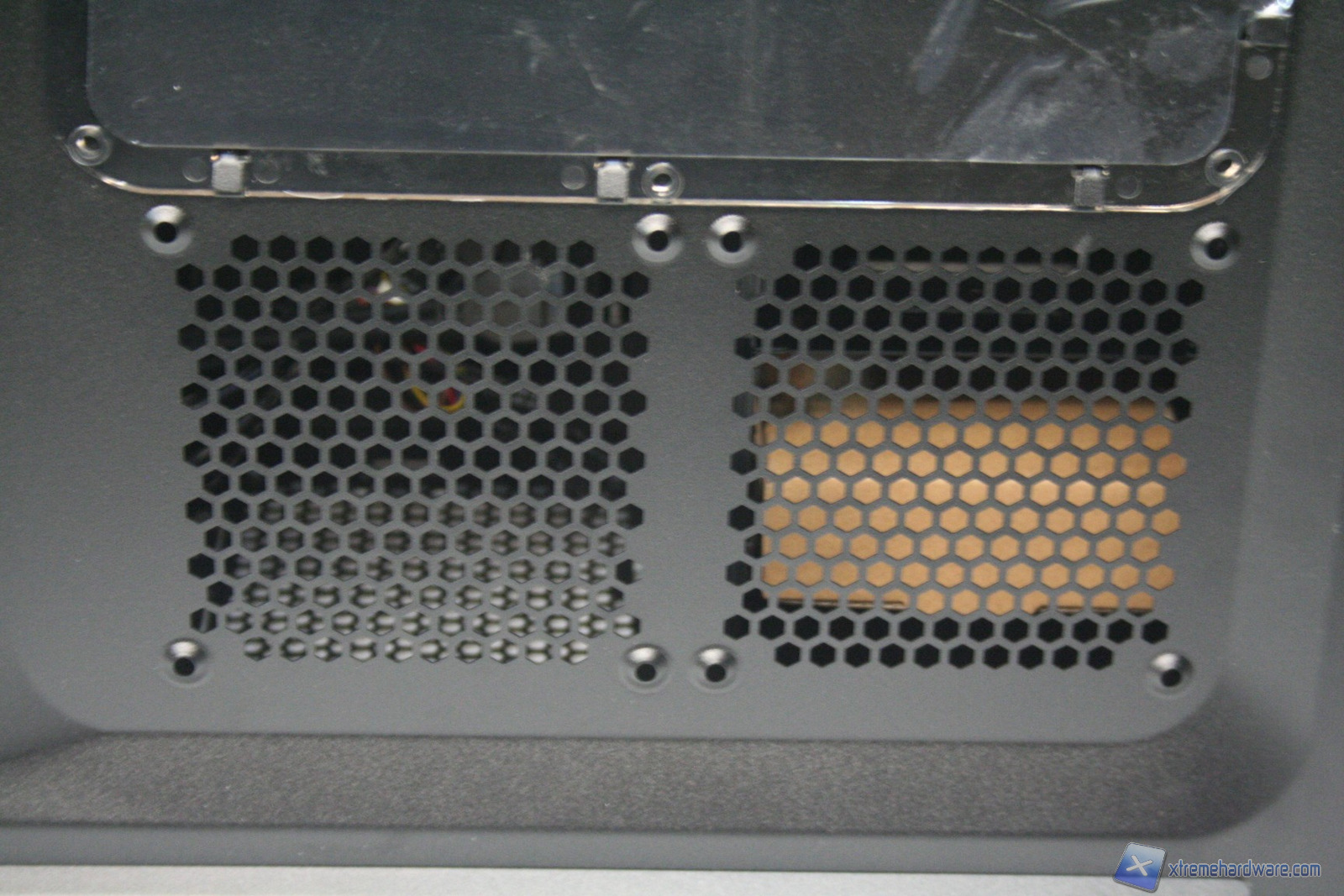 Posteriormente abbiamo una configurazione classica, con alimentatore nella parte inferiore, 7 slot di espansione PCI che non presentano nessuna apertura d’aerazione, due piccole fessure per l’installazione di tubazioni a liquido nella parte superiore, la predisposizione per una ventola da 120mm ed infine è presente un sistema laterale di passaggio e bloccaggio dei cavi, che permette di non far rimuovere periferiche dall’esterno. Tale sistema, posizionato accanto agli slot PCI è denominato Storm Guard ed è particolarmente utile durante i LAN Party poiché impedisce il furto di periferiche quali mouse, tastiera ed headset. Utilizzando tale accorgimento, sarà necessario aprire il pannello laterale per poter estrarre il connettore dal cabinet. Lo spessore del cabinet in questa zona è modesto, ma la presenza di bombature su entrambe le paratie facilita l’installazione di dissipatori voluminosi e il cablaggio posteriore.