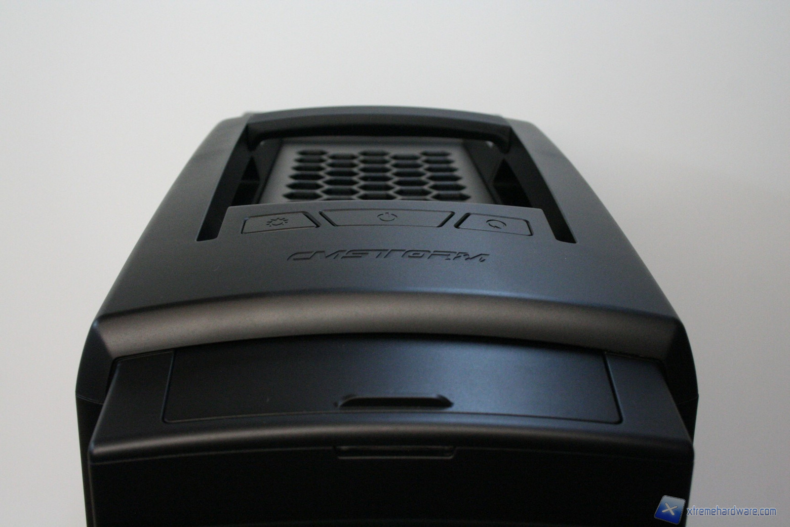 La parte frontale è caratterizzata da una struttura in plastica dura su ogni lato mentre al centro è presente una finitura in mesh, con il logo CM STORM nella parte bassa. Non sono presenti elementi distintivi quindi c’è un layout elegante e lineare, con un tocco di modernità. Nella parte superiore sono presenti tre alloggi per periferiche da 5.25”. Sotto sarà possibile installare due ventole da 120mm o una ventola da 140mm. La griglia mesh funge inoltre da filtro per limitare l’ingresso della polvere.