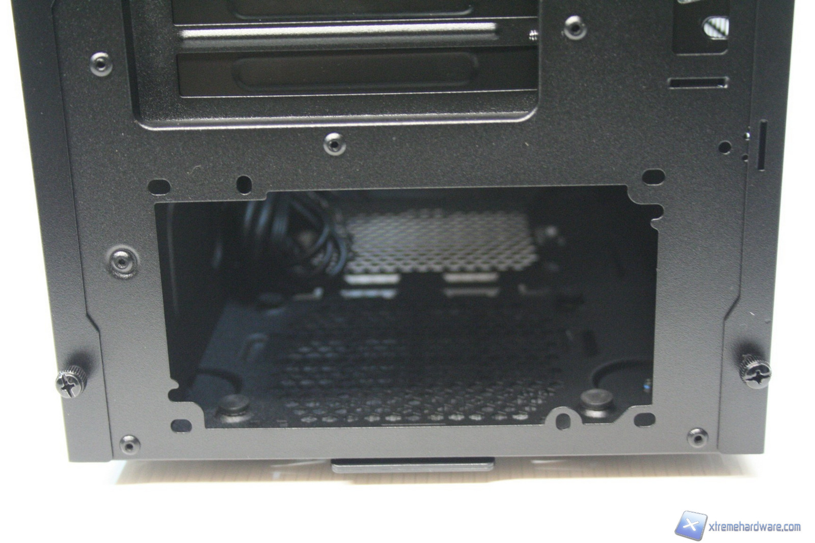 Lo Scout 2 nella parte inferiore presenta una configurazione classica, con un filtro antipolvere sotto alla feritoia di immissione dell’alimentatore, estraibile dall’esterno. E’ presente una seconda apertura per l’installazione di una ventola da 120mm nella parte bassa del cabinet, purtroppo sprovvista di filtro. Sono tuttavia presenti degli agganci per un filtro opzionale, ma avremmo preferito che fossero ruotati di 90° in modo da facilitarne l’estrazione lateralmente, senza dover sollevare il cabinet. Sul fondo del cabinet troviamo inoltre i 4 classici piedini di appoggio, con funzione di assorbimento delle vibrazioni.