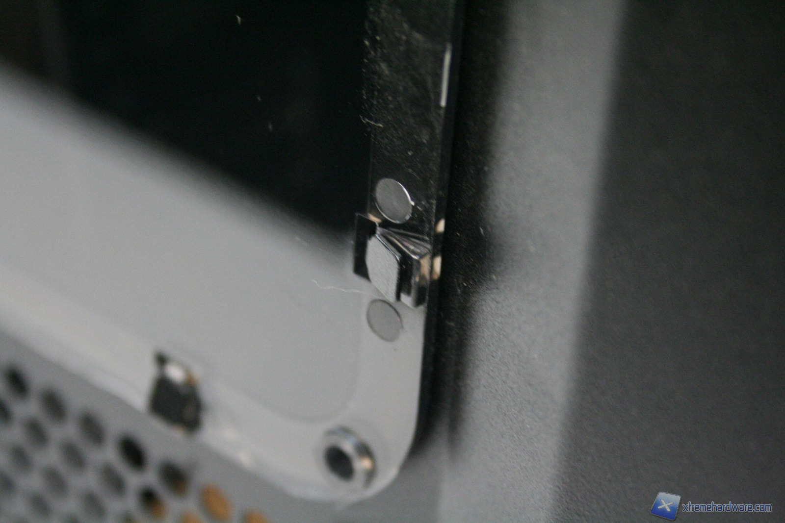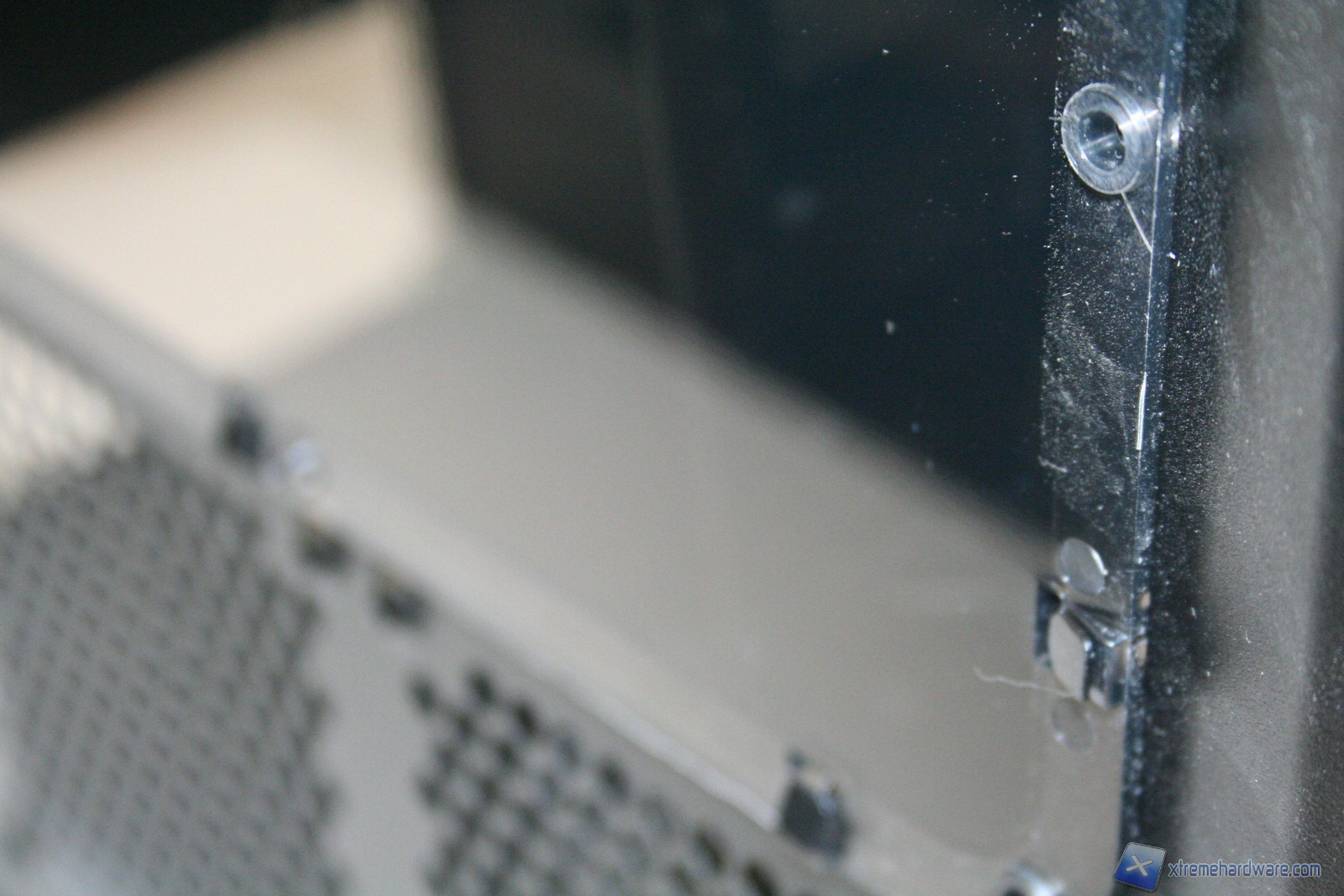 Il telaio delle paratie laterali è molto robusto e la paratia di destra è dotata di una finestra in plexiglass, ben realizzata. Purtroppo non è presente alcun materiale fonoisolante. Sarebbe stato interessante implementarlo, anche se non è questa la configurazione adatta, per via delle  aperture frontali e laterali.  Le aperture laterali non presentano filtri antipolvere, purtroppo.