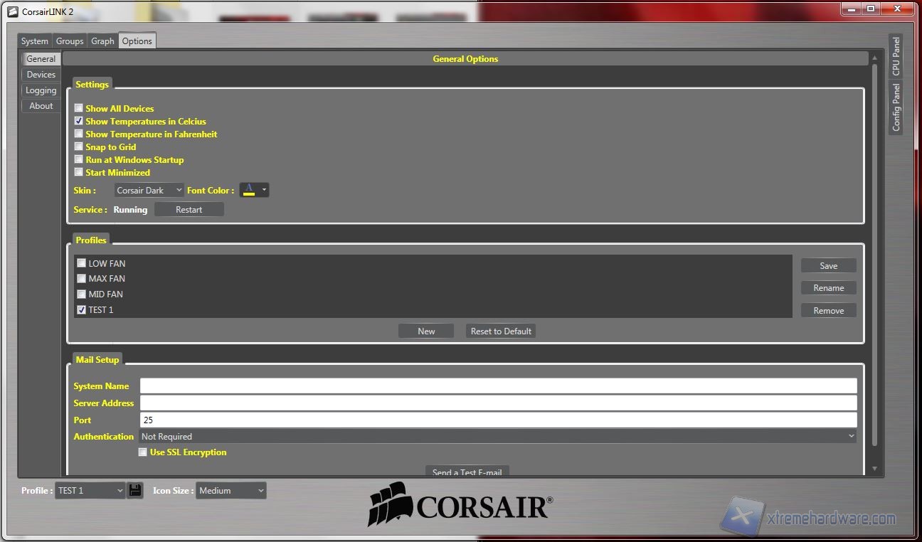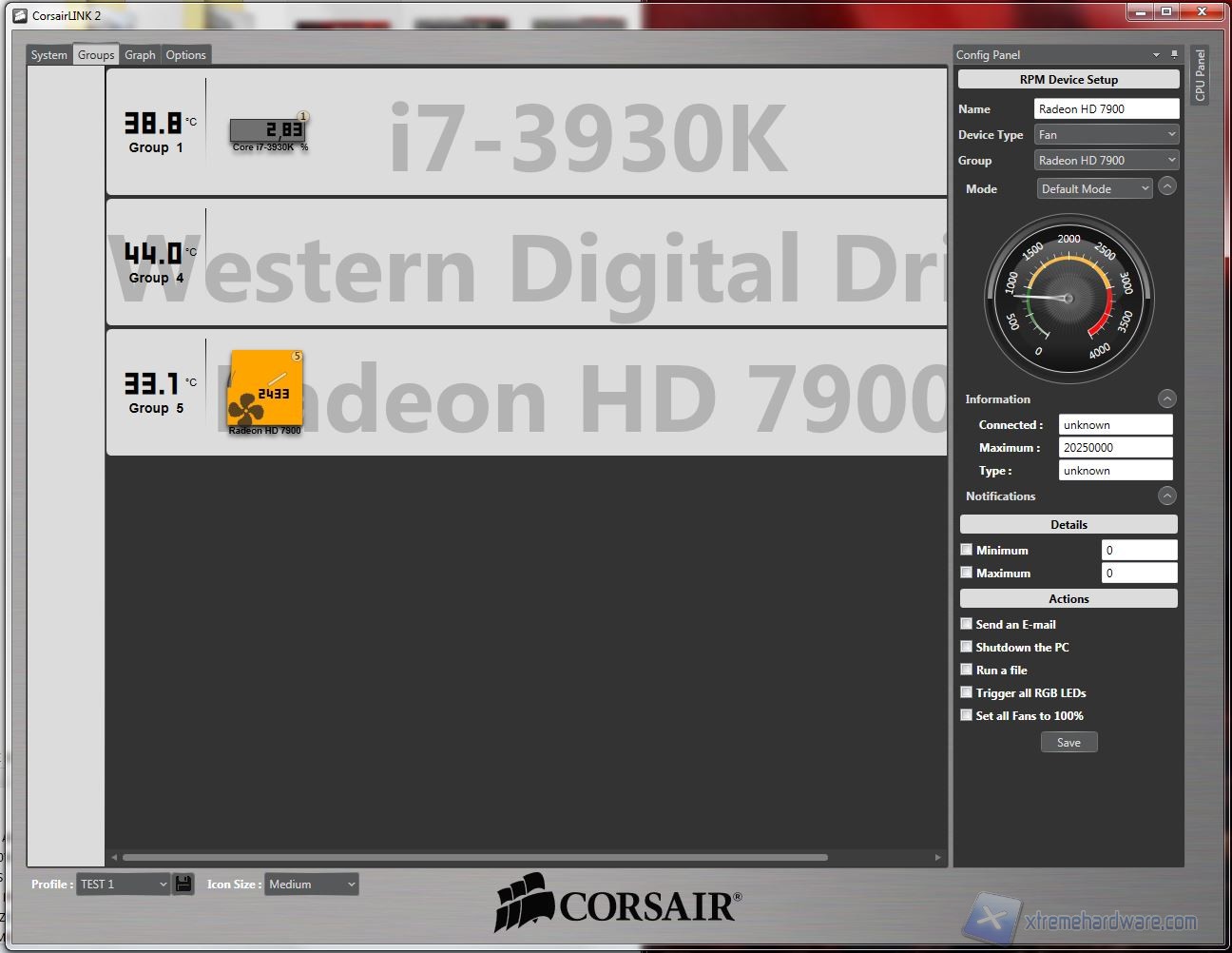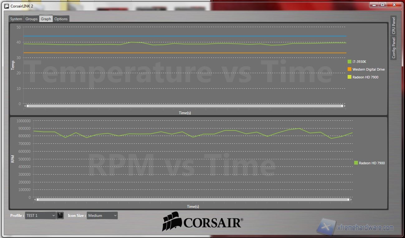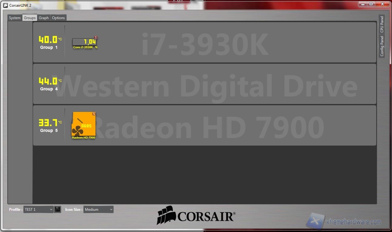 System: da qui potrete osservare direttamente sullo schermo le temperature, ripartire con delle icone che possono essere spostate e posizionate sopra le componenti. Sono disponibili diversi sfondi, raffiguranti cabinet Corsair, ma possono essere importate immagini personali, come vedrete a breve. Da qui, cliccando su ogni icona, è possibile selezionare molti parametri; un particolare degno di nota, oltre alla presenza di diversi profili customizzabili (ad esempio “Silence” o “Turbo”), è la possibilità di settare diverse icone, e quindi componenti, all’interno di gruppi, come vedremo nella prossima schermata denominata appunto “Groups”. Nella seconda fotografia potete osservare che è possibile fissare sulla schermata i dettagli relativi alle opzioni ed alla temperatura e l’utilizzo in % della CPU. Facciamo notare che la temperatura della CPU corrisponde a quella massima rilevata da Coretemp mentre quella della GPU è relativa al “GPU Core”, rilevabile da GPU-Z. Senza scendere in inutili dettagli, è particolarmente lampante il loro utilizzo quindi vi mostriamo direttamente le fotografie: