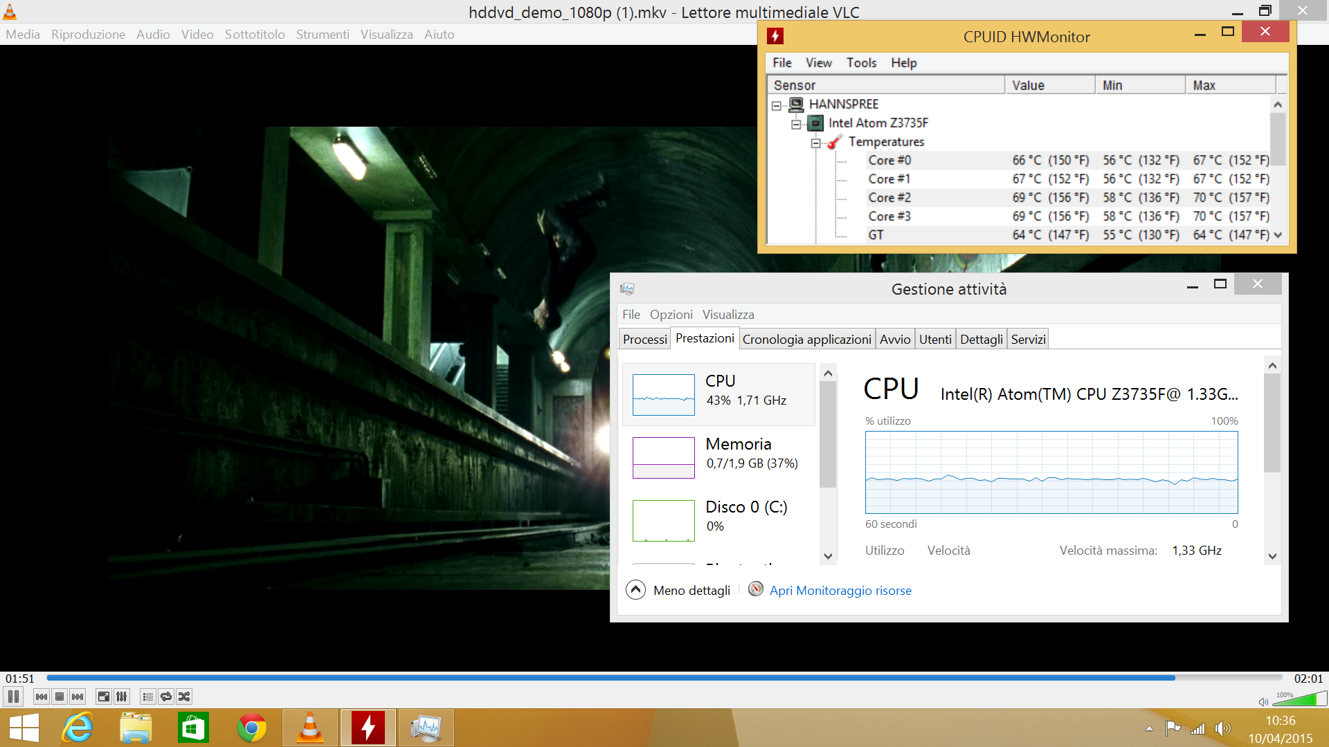 Abbiamo perciò provveduto a testare il micro PC con un paio di video ad alta risoluzione caratterizzati da due formati differenti, il primo è un MKV a 1080p mentre il secondo è un MP4 in 4K. In entrambi i casi abbiamo notato un aumento notevole della temperatura della CPU che, però, si è mantenuta comunque entro valori accettabili (mai sopra i 70-75 °C). Abbiamo dovuto constatare, purtroppo, che con alcuni video girati in MKV a 1080P la CPU incontra qualche difficoltà nel mantenere un framerate costante mentre con i video in formato MP4, anche ad altissima risoluzione, non abbiamo incontrato alcun problema.