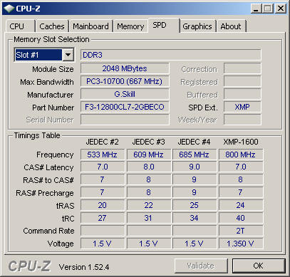 Le memorie prevedono un profilo XMP, “Extreme Memory Profiles”, pertanto è indicato nella timings table l'impostazione a 800 Mhz di clock con timings 7-7-7-18 e voltaggio di alimentazione corrispondente di 1.90V così come indicato sull'etichetta posta sul modulo memoria.