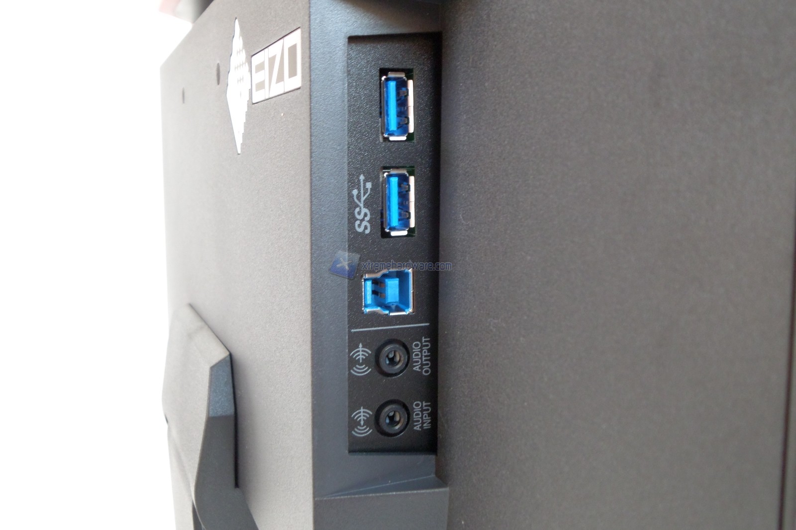 Il lato sinistro presenta l’uscita jack audio all’altezza della barra frontale che integra gli speaker. Sarà quindi possibi collegare comodamente un paio di cuffie al monitor. Dietro al display sono presenti altri connettori audio, input e output, e la porta USB type-B per abilitare le due USB 3.0.