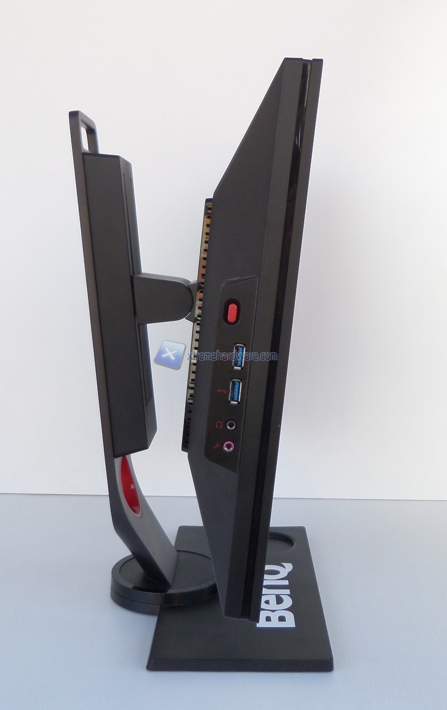 Il lato destro non presenza elementi degni di nota, mentre sul sinistro sono presenti due porte USB 3.0 e le connessioni jack audio per l’ingresso microfono e l’uscita cuffie; essendo posizionate all’esterno, queste porte risultano di facile accesso. Nella stessa zona BenQ ha inserito un gancio per appendere il proprio headset da gaming, estraibile dopo un click come mostrato in foto.