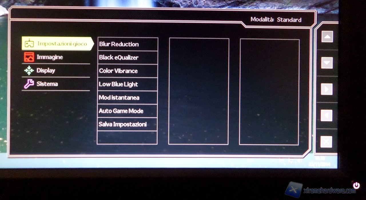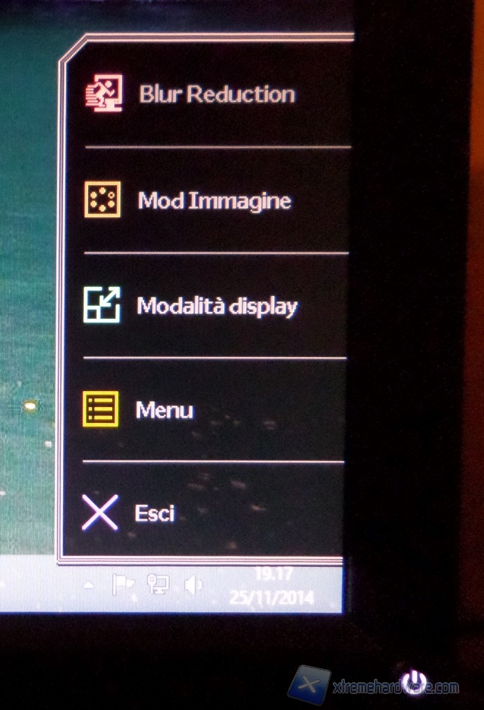 Alla pressione di uno dei cinque tasti appare il menù di scelta rapida con tre modalità personalizzabili; di serie sono presenti Blur Reduction, Mod Immagine e Modalità display, e l’accesso al menù completo. Andando in ordine, Blur Reduction, disponibile solo se la frequenza è di 100 Hz o superiore, è una funzione che può essere attivata e personalizzata con i parametri Intensità (dal valore 1 a 25, con valore 10 di default, per migliorare la sfocatura agendo sulla luminosità) e Area (0 – 100, con valore di default a 10 e conviene ternerlo basso); Mod Immagine presenta delle modalità predefinite (eloquenti) con tre profili personalizzabili (Giocatore), richiamabili rapidamente con il controller S Switch; Mod Display offre le varie modalità di mapping.