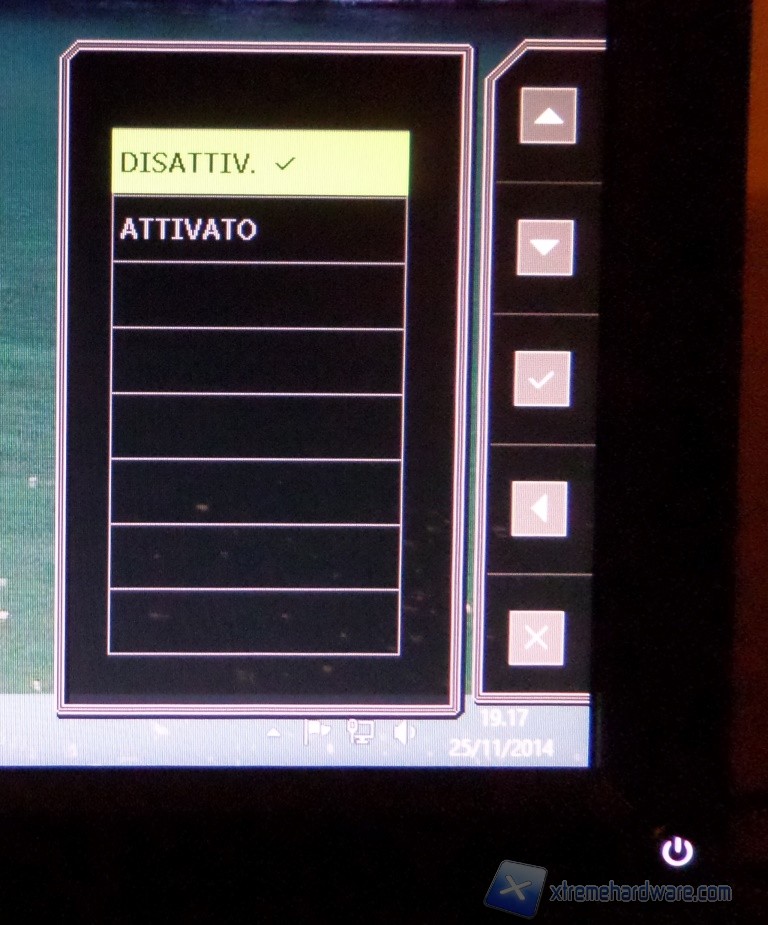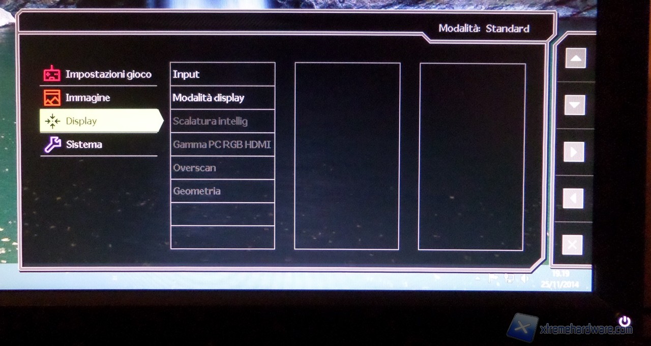 Che il monitor sia destinato quasi esclusivamente al settore gaming lo si intuisce entrando nel menù completo, dove nel primo tab troviamo un bel "Impostazioni gioco" con varie opzioni, quali; Blur Reduction, Black eQualizer (intervallo 0-20, tende a schiarire le zone più scure durante il game), Color Vibrance (0-20, che modifica i colori da una riproduzione bianco e nero, fino a sovrassaturare le tonalità), Low Blue Light (0-10, per regolare l’intensità della luce blu), Mod istantanea (ON/OFF, per ridurre varie elaborazioni di immagine durante il gaming e diminuire il tempo di lag), Auto Game Mode (ON/OFF, rileva il gioco avviato per poi applicare automaticamente la modalità adatta) e infine con Salva Impostazioni si possono impostare i setting sui tre profili Giocatore. Preset rilasciati dai professionisti del gaming (Game Mode Loaders) non sono ancora presenti nella pagina ufficiale, ma potranno essere inseriti tramite il software DisplayPilot. Nel tab Immagine si trovano i classici parametri con cinque valori presenti per il Gamma, quattro per la Temperatura colore (di cui una RGB personalizzabile), tre setting per l’overdrive AMA (Disattiv., Alto e Premium) e la modalità Senseye Demo che confronta due delle Mod immagine selezionabili.