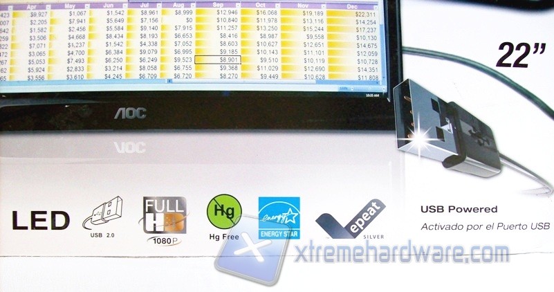 La confezione misura 560 x 380 x 110 mm e rappresenta in breve le caratteristiche del monitor. L’immagine sulla parte frontale ci informa subito per quali esigenze l’AOC e2251Fwu è indicato. Nella stessa viene riportato infatti il monitor, senza piedistallo, collegato ad un notebook in configurazione Duplica. Nella zona inferiore sono indicate le funzionalità quali la compatibilità con piattaforma PC e Mac, il sistema di retroilluminazione a LED, la connessione USB 2.0, la risoluzione Full HD 1080p, certificazioni ENERGY STAR 5.0, EPEAT Silver e l’assenza di mercurio.