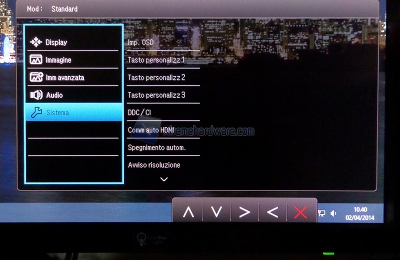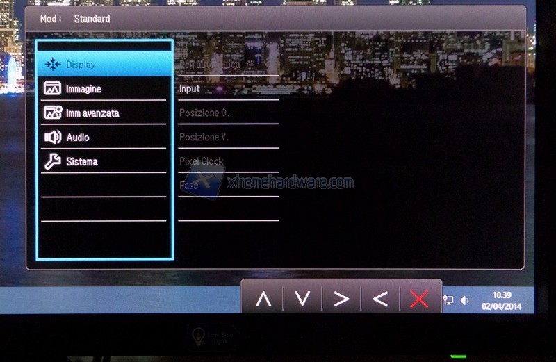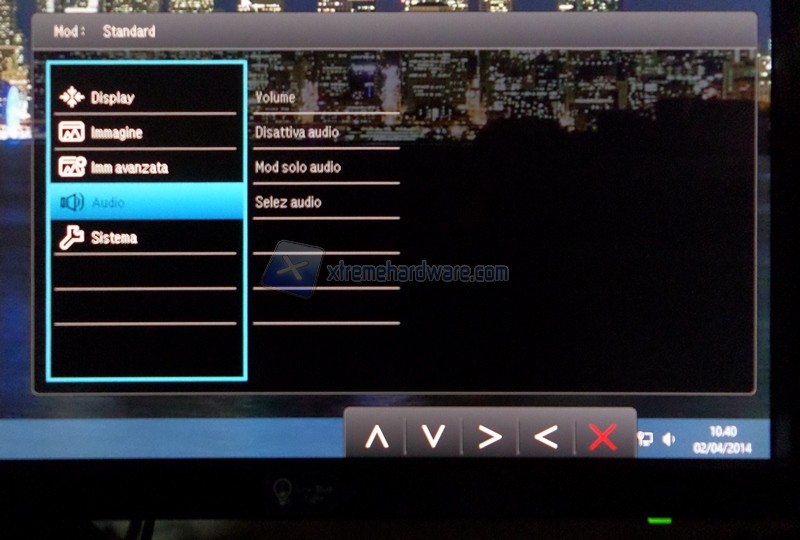 I tre comandi di selezione rapida, personalizzabili nel menù “Sistema”, presentano di default: tecnologia Low Blue Light, switch tra le sorgenti e la regolazione del volume degli speaker integrati. Il quarto permette l’accesso al menù completo e per il quinto appare abbastanza evidente il significato; tasto back.