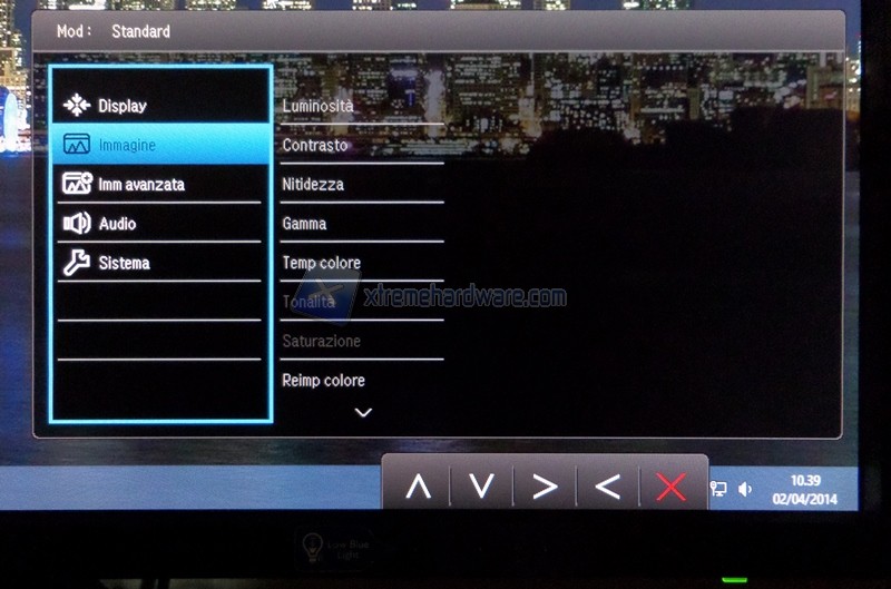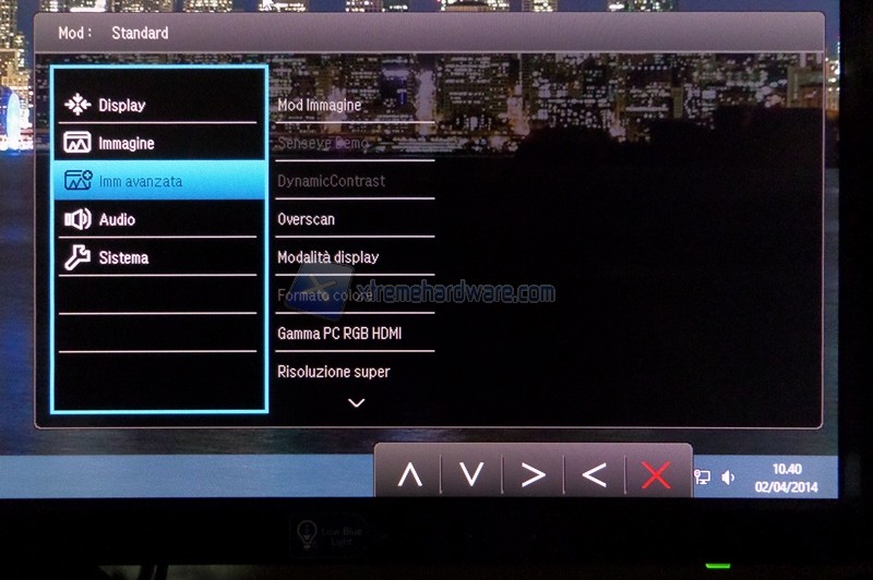 In Immagine avanzata si può scegliere la modalità di visione tra le seguenti: Standard, Riduz. luce blu (Low Blue Light), Cinema, Giochi, Foto, sRGB, Eco, M-book (MacBook) e Utente. Quest’ultima sblocca le funzioni Tonalità e Saturazione viste in Immagine e aggiunge la possibilità di agire sulla terna RGB in Temp Colore. Il comportamento della tecnologia Low Blue Light verrà analizzato nel capitolo successivo. L’ultima funzione è chiamata Fuoco Intellig. e va a creare un rettangolo di visione in cui il restante contorno viene oscurato. Le dimensioni e la posizione del riquadro possono essere regolate.