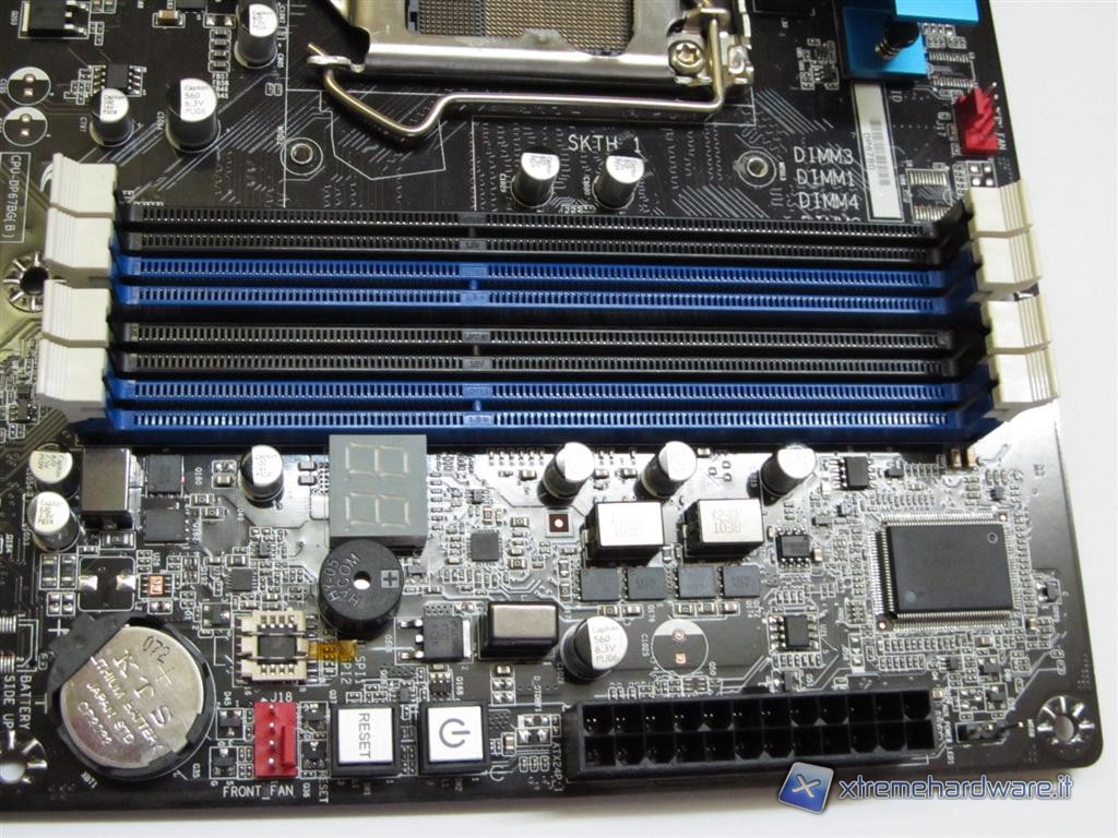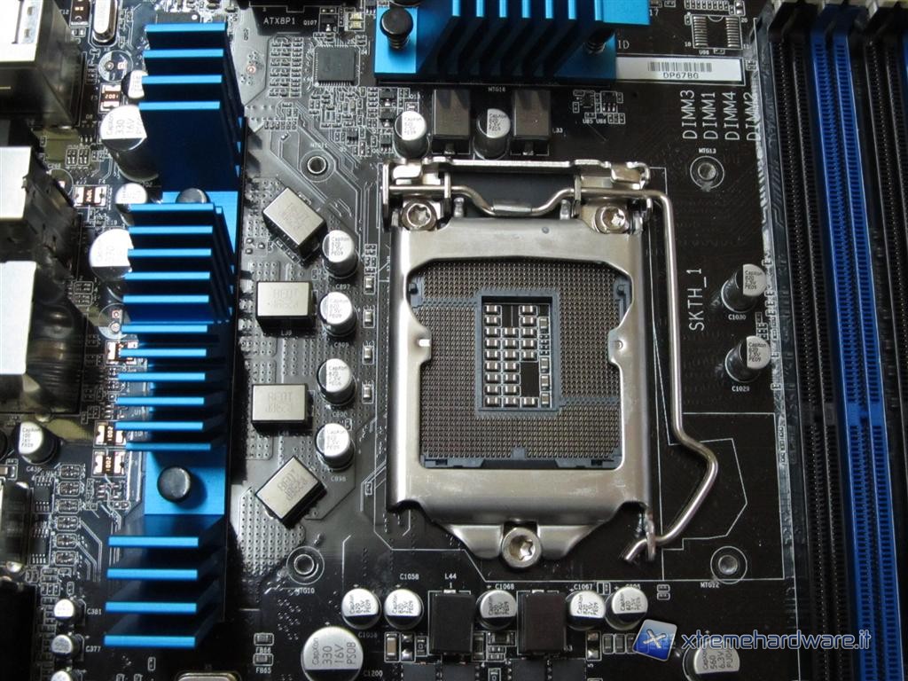 Proseguendo l’analisi della scheda passiamo alla zona dedicata al socket 1155. Possiamo osservare i dissipatori blu dedicati al raffreddamento dei mosfet, mentre molto vicino al socket, spostati sulla destra, possiamo vedere i 4 slot dedicati alle RAM. Ricordiamo che questa mainboard supporta sino a 16GB di RAM 1600mhz in modalità Dual Channel.