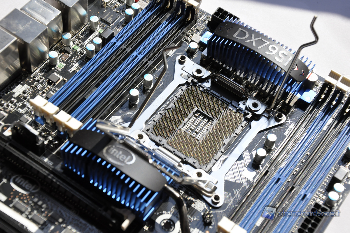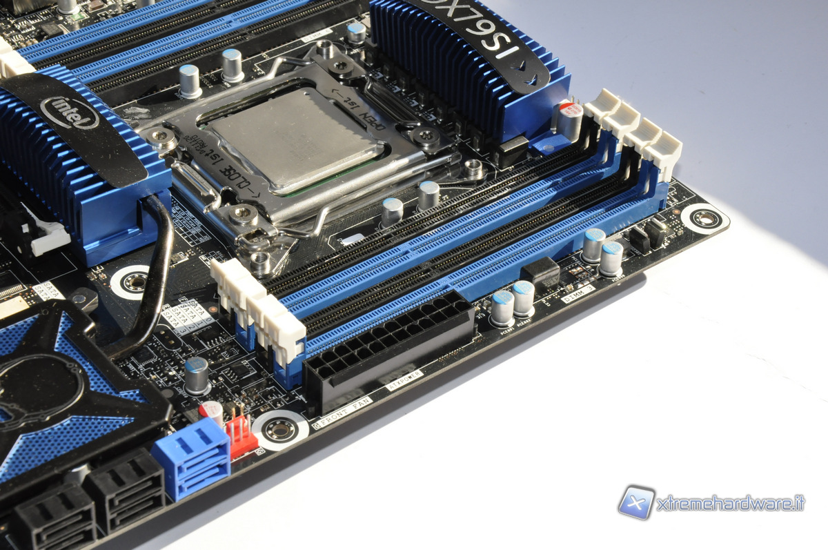 Sopra al socket troviamo il sistema di alimentazione, ricoperto da un dissipatore con la scritta DX79SI. Le CPU LGA 2011 necessitano di un sistema di alimentazione molto efficiente, per via delle potenze  richieste in oveclock e del ridotto spazio a disposizione, occupato su due lati dai moduli di memoria. Troveremo quindi quasi sempre fasi di tipo Driver MOSFET (DrMOS) accompagnati da condensatori di tipo Hi-C cap.