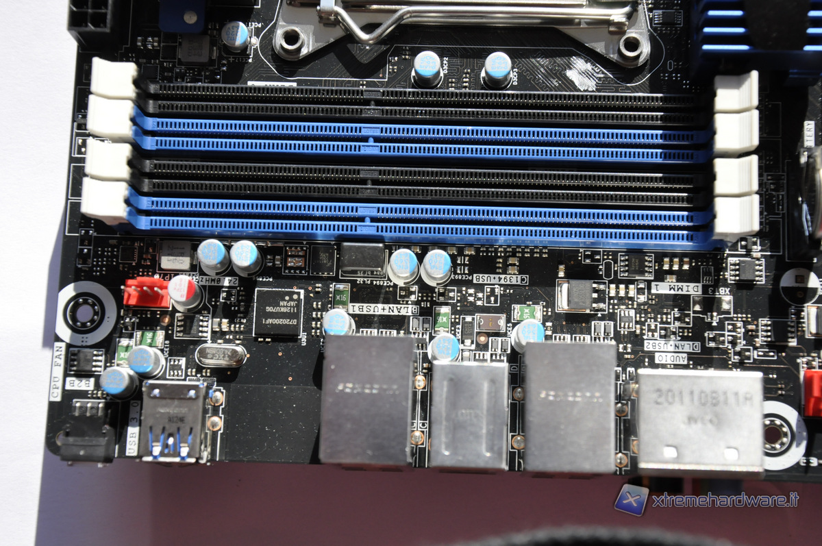 Iniziamo l’analisi della scheda dalla parte alta, dove spiccano gli 8 slot DDR3 disposti ad ambo i lati del socket e capaci di supportare fino a 64GB di memoria. La vicinanza degli slot al socket, impone l’utilizzo di moduli con dissipatore a basso profilo, oppure di dissipatori particolari, quindi a liquido, a torre ma stretti, o con orientamento orizzontale. Il socket LGA 2011 è sempre di tipo Lan Grid Array, quindi con 2011 che spuntano dal socket. Il numero così elevato di pin è da imputare al controller di memoria quad channel e all’elevato numero di linee PCI Express. Il socket LGA 2011 dispone di un nuovo sistema di aggancio, dotato di filettatura direttamente nei fori del socket, permettendo un sistema di aggancio più pratico ed affidabile rispetto al vecchio sistema push-pin.