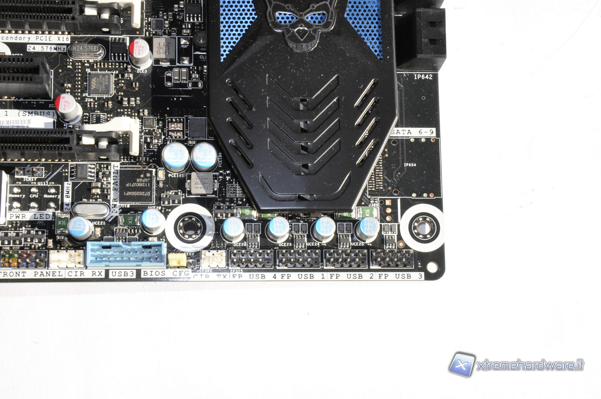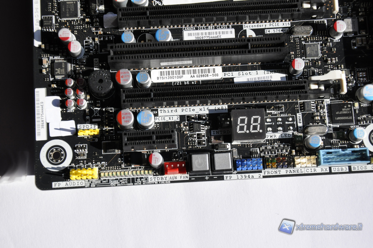 Come header interni abbiamo 4 coppie di USB 2.0, una coppia di USB 3.0 supportate dal controller NEC D720200AFI, porta 1394 e connettori audio. In questa zona notiamo anche due pulsanti onboard di power e reset e un display per il debug.