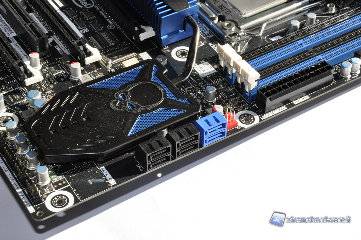 Dal lato connettività per lo storage troviamo due porte Sata 6Gb/s (blu) e 4 Sata 3 Gb/s (nere), gestite dal chipset X79 che è raffreddato da un corpo in alluminio con stampato il teschio simbolo delle Extreme Desktop board, e da una heatpipe collegata ad un altro corpo dissipante passivo.