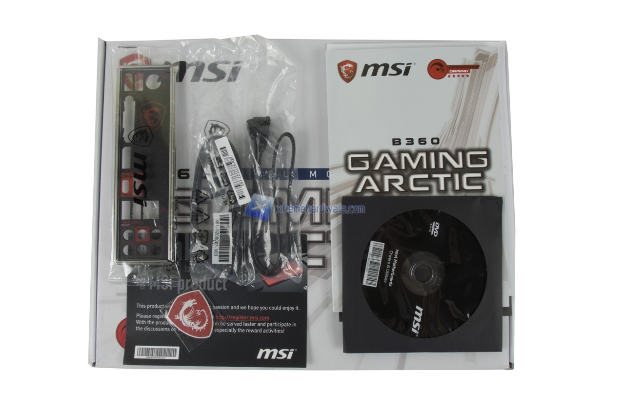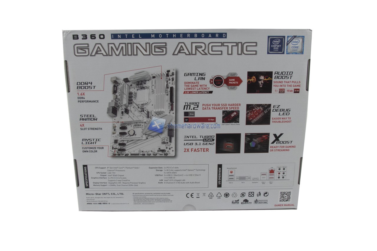 Classica confezione di cartone di forma rettangolare ma di colore bianco per la MSI B360 Gaming Arctic. La grafica e colorazione ovviamente sono inerenti il modello e serie. Vengono riportate tutte le principali caratteristiche, specifiche e informazioni circa il modello.