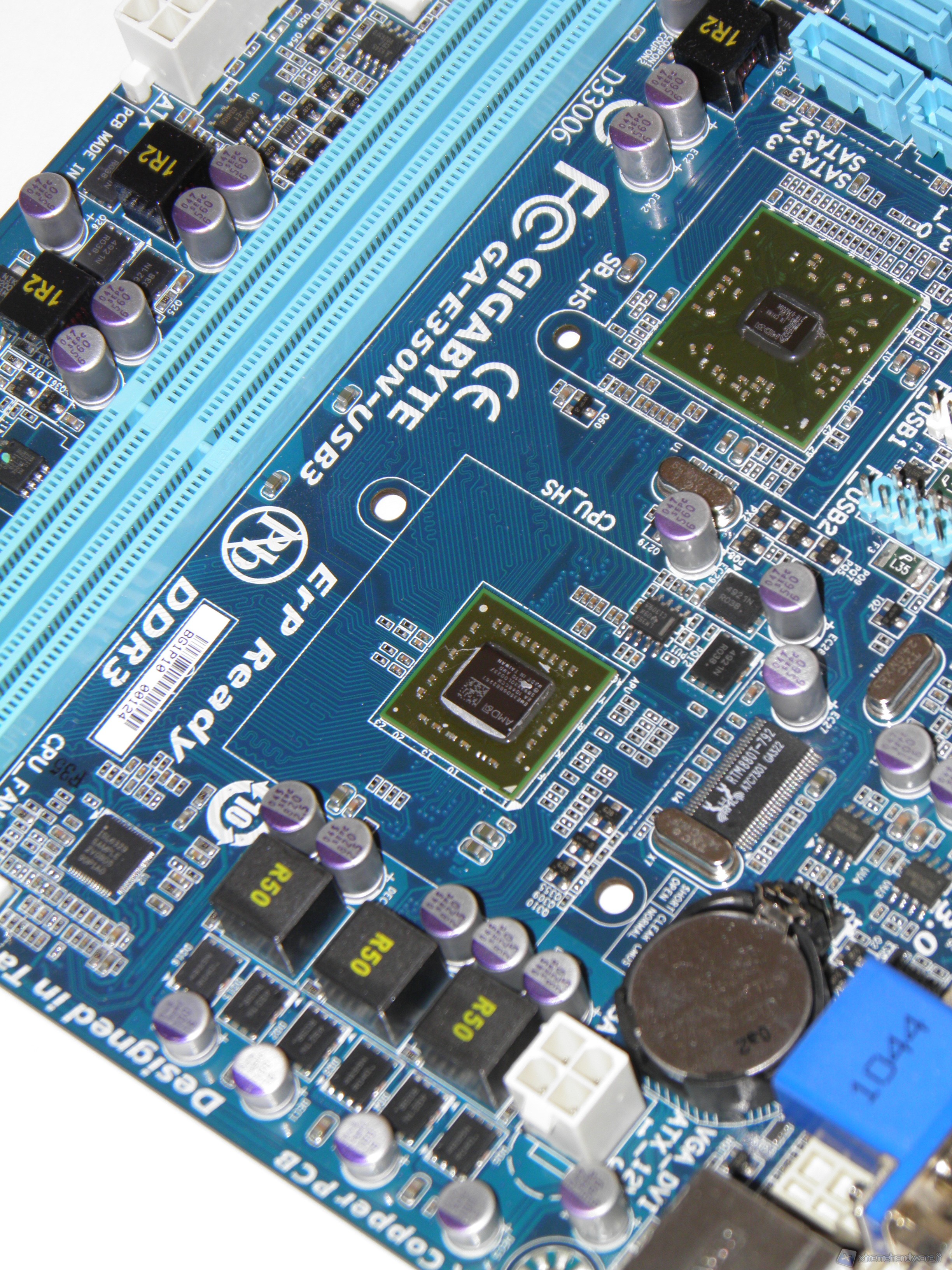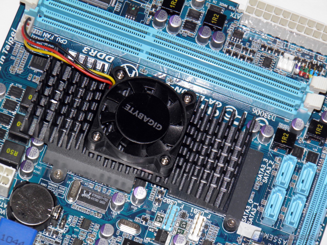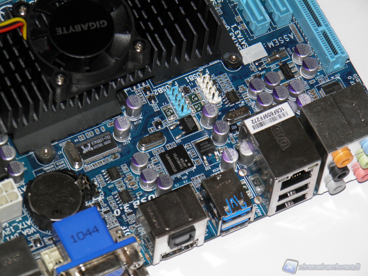 Sotto al dissipatore appaiono le due componenti della piattaforma Brazos, L’AMD E-350 e Hudson M1. Durante la rimozione del dissipatore è emersa una curiosa scelta tecnica da parte di Gigabyte. Il dissipatore infatti non è direttamente a contatto con APU e SB, ne tantomeno un monoblocco in alluminio. La parte superiore è fissata su due piastre a loro volta appoggiate sui rispettivi DIE. Tra dissipatore e piastre è stata messa una piccola quantità di pasta termica.