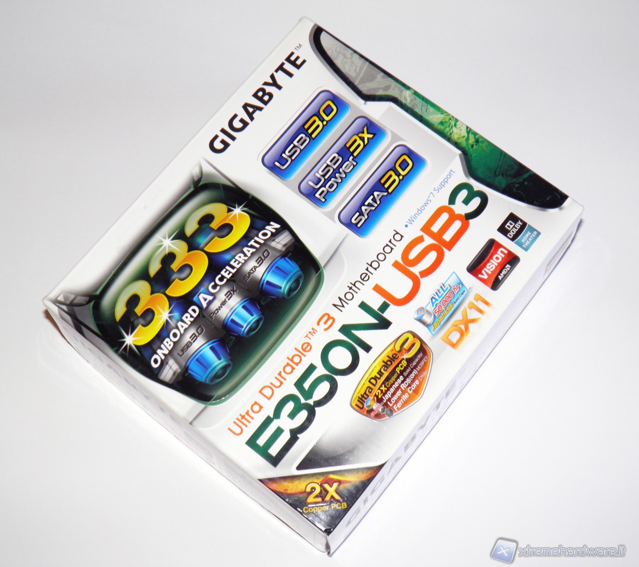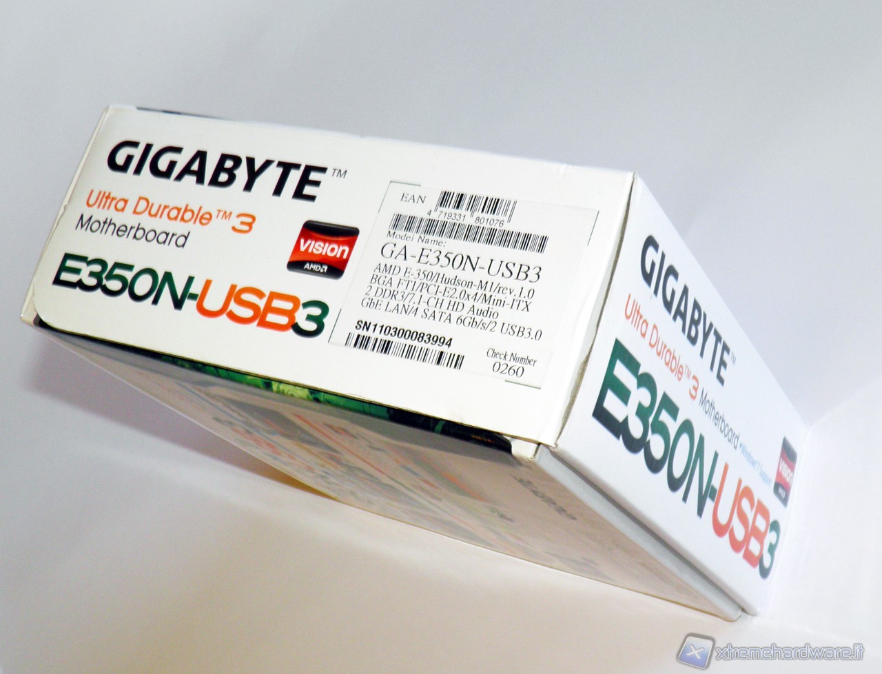 Presa in mano la scatola della E350N-USB3 non possiamo che rimanere stupiti dalle ridotte dimensioni, la parte superiore riporta, come di consueto, il modello della scheda nonché alcune delle più importanti caratteristiche come la connettività 3.0 e la potenza delle porte USB triplicata.