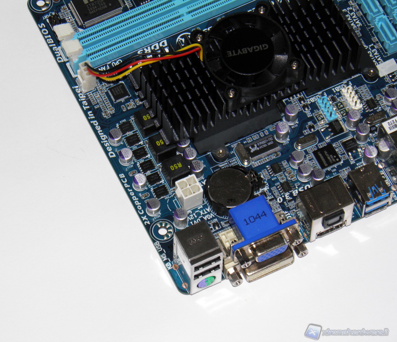 Gigabyte anche per questa schedina non si è limitata ad usare fasi di bassa qualità, tre fasi di tipo Low RDS con induttanze in ferrite si occupano dell’alimentazione della nostra APU, situate nella parte superiore e vicine al connettore di alimentazione a 4 pin ausiliari.